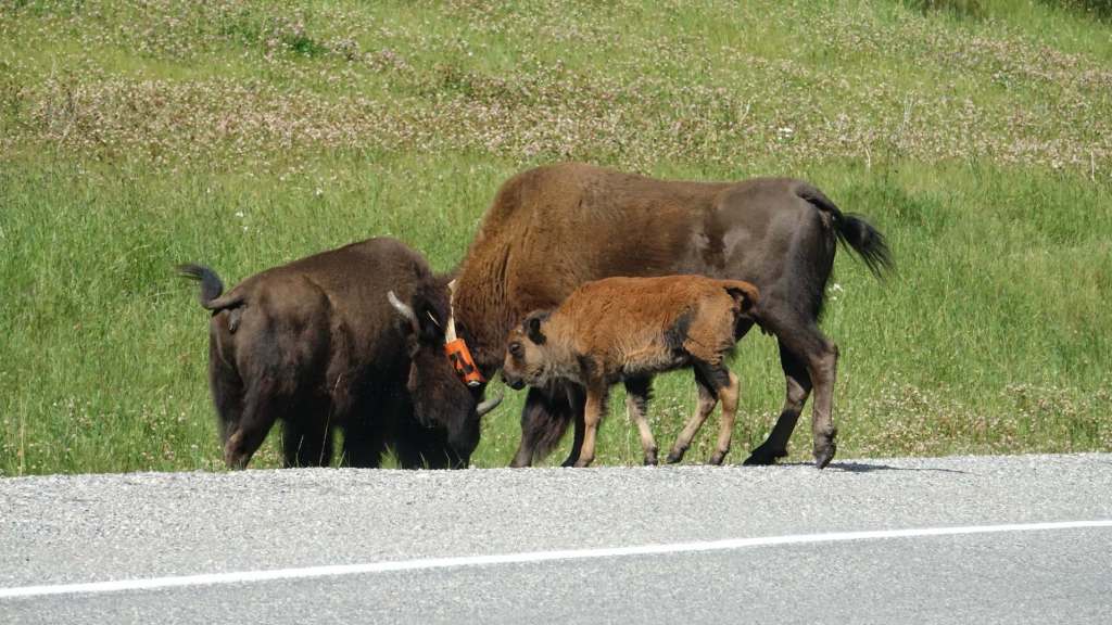 Es ist schon erstaunlich, wen man hier unter den wenigen Reisenden so alles antrifft. Deutsche machen dabei, zusammen mit den Schweizern, schon einen erheblichen Anteil aus, jedenfalls wenn man nach den Fahrzeugkennzeichen urteilt. Nordwestlich des Muncho Lake flachen die Bergrücken wieder ab. Hier beginnt das Land der Bisons, von denen mir einige über den Weg laufen. Es sind gewaltige Viecher mit einer bemerkenswerten Schwerfälligkeit. Nur einmal taucht auch ein Jungtier auf.