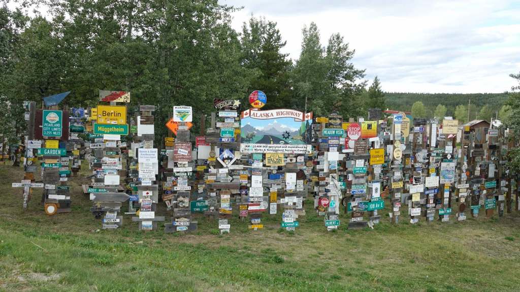 Bis Watson Lake passiert dann nicht mehr viel. Es tauchen links und rechts sogar landwirtschaftlich genutzte Flächen auf, aber in viel kleinerem Stile als in Saskechewan und Manitoba. Watson Lake ist schließlich der erste „größere Ort“ seit langem mit wenigen hundert Einwohnern. Hier möchte man nicht „tot über dem Zaun“ hängen, fällt mir als Spruch zu Watson Lake ein. Der einzige Dorfladen bietet so ziemlich alles an, dafür ohne jegliche Auswahl und ohne jeglichen Sinn für die Darbietung von Waren. Alles liegt irgendwie neben- und übereinander. Die Kassiererin verkauft mir mürrisch eine Flasche Wasser für 5$! Trotzdem will Watson Lake repräsentieren, was sich zumindest in der liebevoll gestalteten Touristeninfo zeigt, in der ich mir einen Film zum Bau des Alaska Higways anschaue. Dieser wurde 1942 in nur 10 Monaten auf Geheiß von Präsident Roosevelt gebaut als strategische Maßnahme gegen die Japaner nach deren Angriff auf Pearl Habour. Man befürchtete eine Besetzung Alaskas durch Japan und wollte dem durch eine Straße dorthin entgegenwirken. Vor der Touristeninfo steht ein beeindruckender Schilderwald mit Orts- und KFZ-Schildern aus aller Welt, darunter auffällig viele aus Deutschland!