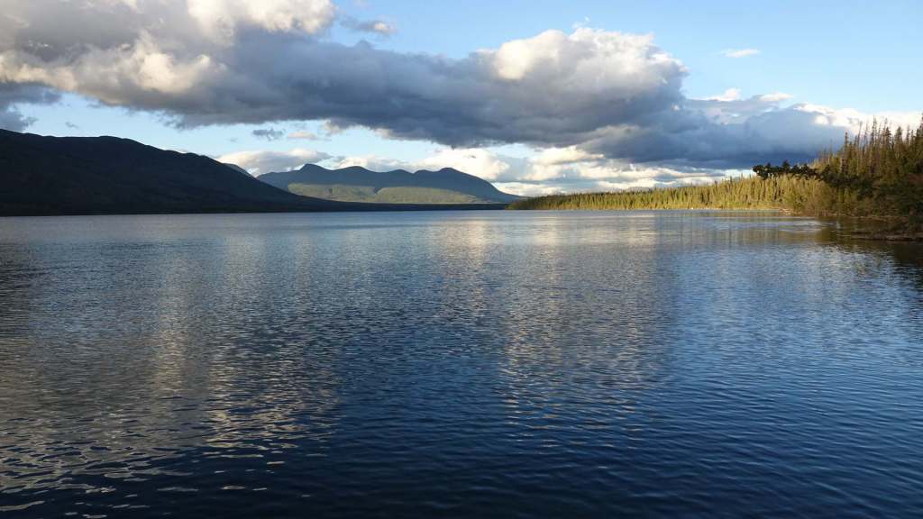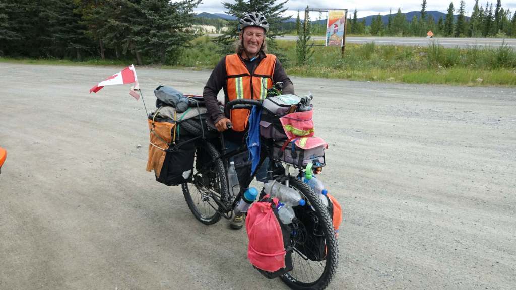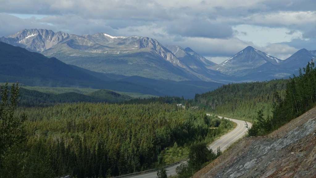 Hier tanke ich und nutze seit zwei Tagen erstmals wieder das Internet. Mit meiner kanadischen SIM habe ich hier im Yukon niergends mehr Empfang – war wohl doch der falsche Provider, den ich gewählt habe! Ich telefoniere mit zuhause und schaue mir auf dem Handy die Wetterkarte an. Oh, das sieht nicht gut aus! Gar nicht gut! Vorsorglich packe ich mich ein und traue mich in die tief blau gezeichnete Wetterfront, die zwischen Teslin und Whitehorse verläuft. Kurze Zeit später überhole ich einen auffällig schwer beladenen Radfahrer mit kanadischer Flagge. Es ist David aus Alberta. Er ist bereits seit neun Monaten unterwegs. In Argentinien gestartet, trägt er ein Fläschchen Atlantikwasser im Gepäck, dass er zusammen mit einigen Leuten der First Nation in den Northern Territories in die Arktische See schütten und so die Welt vereinen will. Ein schöner Gedanke in diesen unfriedlichen Zeiten – möge es helfen!