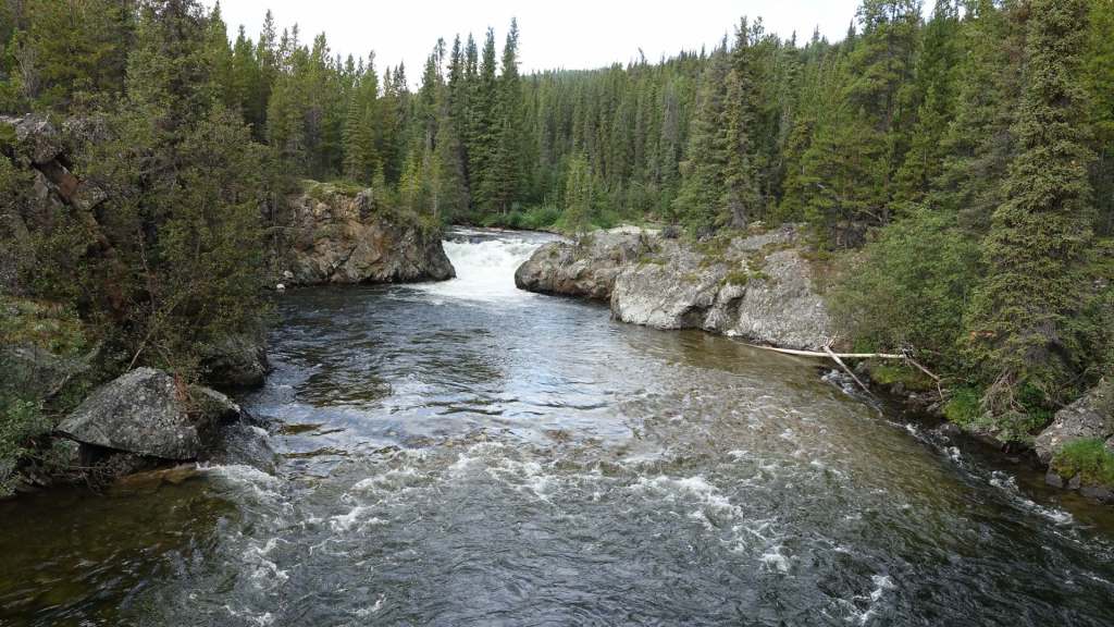 Am Mittwoch, den 17. August, mache ich mich schon früh auf den Weg und bereue schon bald, keinen Pullover angezogen zu haben. Das Thermometer zeigt gerade mal 10 Grad! Am Mittag sind wieder gut 20 Grad erreicht. Die Landschaft bäumt sich wieder auf. Jetzt zeigen sich sogar die ersten Schnnekappen auf den Gipfeln. Anders als in den Alpen sind die Täler zwischen den Bergketten sehr viel breiter. Man hat so auch in den Tallagen eine beachtliche Weitsicht. In der Touristeninfo von Watson Lake habe ich eine Liste der Sehenswürdigkeiten und Infrastruktur entlang des Highways erhalten. Die einzige Sehenswürdigkeit bis Whitehorse ist der Rancheria Wasserfall, den ich links der Straße über einen 15-minütigen Wanderweg erreiche. Ganz schön, doch als Wasserfall würde ich ihn nicht bezeichnen, eher als eine Stromschnelle!