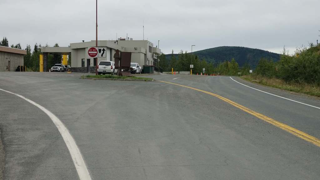Etwas ermüdet erreiche ich nach 4 Stunden auf dem mittlerweile arg ramponierten Alaska Highway bei Kilometer 1905 die Grenzstation nach Alaska. Zum Glück bin ich in dieser Richtung der einzige Reisende, denn die Einreiseformalitäten dauern recht lang. In der Gegenrichtung gab es einen langen Stau, denn die Reisesaison in Alaska neigt sich dem Ende zu. Lustige Fragen habe ich zu beantworten. So etwa, ob ich die Absicht habe einer terroristischen Vereinigung beizutreten, aber auch ernsthaftere, wie die Frage, ob ich seit 2011 im Iran war …nöööö, nicht wirklich! Am Ende erhalte ich zwei schöne Stempel im Pass, den zweiten auf eigenen Wunsch – ein Alaska Stempel! Ich zahle 6 US$ und werde in die Wildnis von Alaska entlassen.