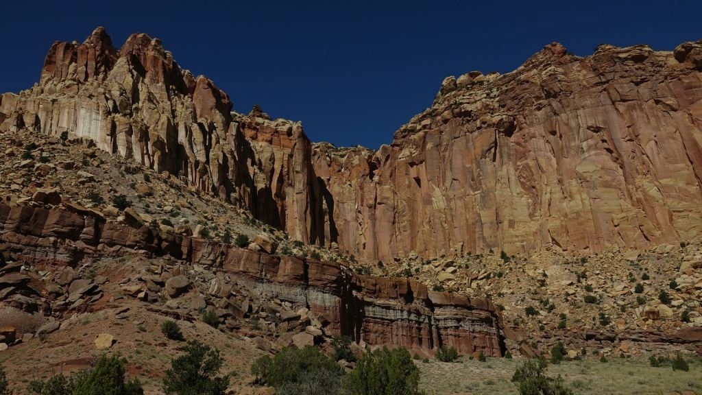 Die Reise gewinnt angesichts der Dichte an Nationalparks eine atemberaubende Dynamik. Nach Arches und Canyonland verlassen wir am Sonntagmorgen unsere Cabin in Moab. Ariane nutzt die Gelegenheit, ein paar Tage bequem und ohne schwere Mopedkleidung zu reisen und leistet Brenda in ihrem Camper Gesellschaft. Auch Steve und ich profitieren, denn der Campingvan, eine Mercedes V-Klasse, nimmt mühelos unser Gepäck auf. Von Moab steuern wir auf dem Weg zu unserem Etappenziel in Tropic erst Capitol Reef, einen kleinen Nationalpark, an. Dieser wurde jüngst durch genau die Regenfälle, die wir vor 5 Tagen in Boulder abgewartet haben, überschwemmt. Somit sind jetzt alle Pisten im Park gesperrt. Wir können nur über den Hauptweg einmal hinein- und wieder herausfahren. Das ist durchaus ganz nett, denn auch der Hauptweg wird von beeindruckenden Abruchkanten der Tafelberge gesäumt.