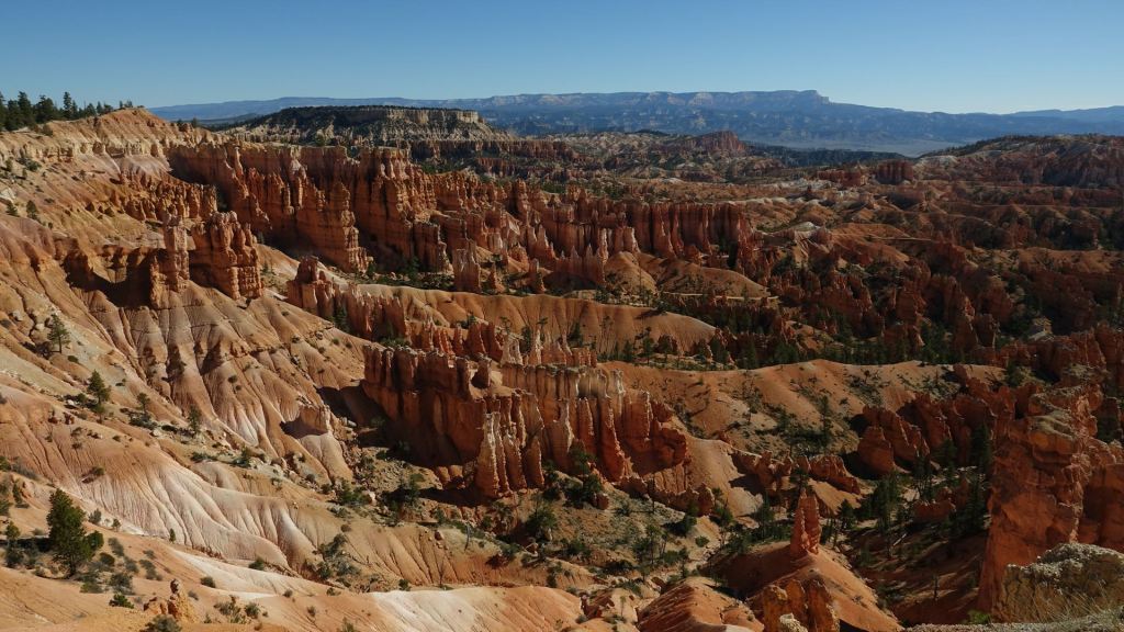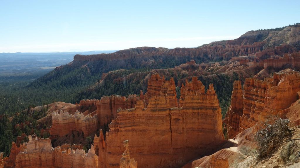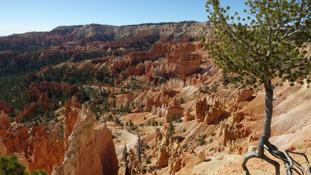 Das Hotel verwöhnt uns am Morgen mit einem guten Frühstück, bevor wir unseren Ausflug in den Bryce Canyon starten. Unsere üppige Ausstattung mit Fahrzeugen erlaubt uns eine kleine Rundreise die wir zunächst mit Brenda’s Van beginnen, dann per pedes fortsetzen und schließlich mit den Motorrädern beenden. Der Van bringt uns an den Rand des Canyons, wo wir allesamt überrascht und geblendet sind von dem orangen Felspanorama, das sich plötzlich vor uns auftut. Wie eine Armee Zinnsoldaten bauen sich tausende von Felstürmen gold-orange illuminiert vor uns auf. Es ist ein wahrer Traum!