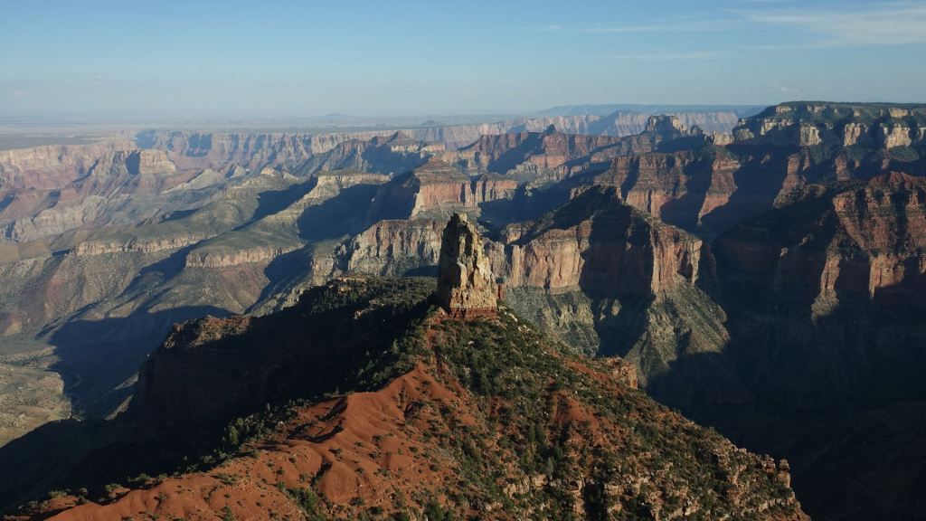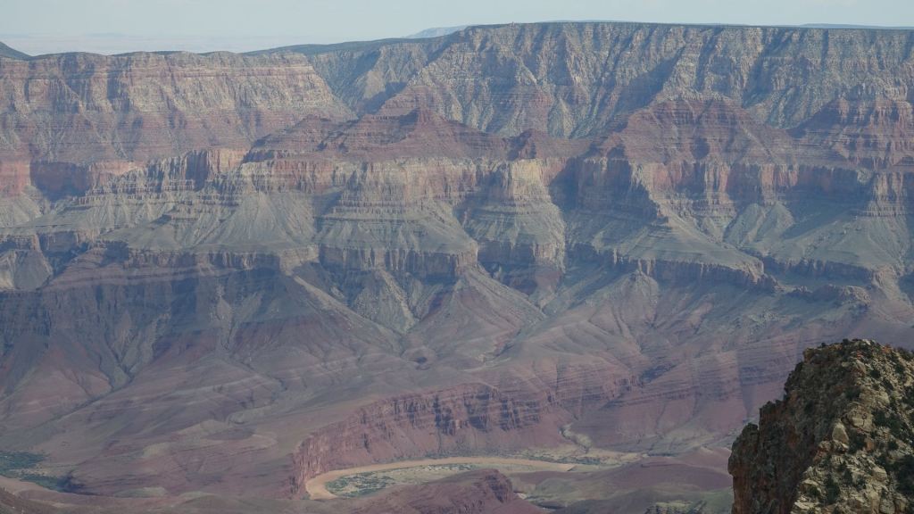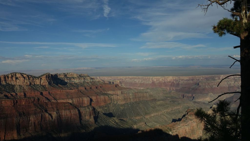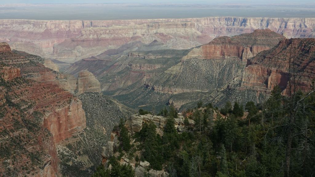 Der Dienstag wird der letzte gemeinsame Tag mit Brenda sein, denn am Mittwoch wird sie die lange Heimreise (gut 3.000 km) nach Cincinnati antreten. Wir starten mit ihrem Van in den Tag, während die Mopeds heute Ruhepause haben. 45 Meilen geht der Highway 67 nach Süden, ehe er auf den Rand des Grand Canyon stößt. Dort erschlägt uns der gewaltige Anblick dieses unermesslich großen Canyons, dessen anderes Ufer so weit entfernt ist, dass die Felsen dort nur im Dunst zu erkennen sind. Die Farben sind einmal mehr so intensiv, dass es einem die Sprache nimmt.