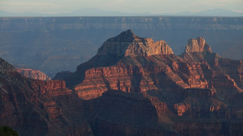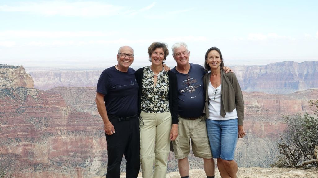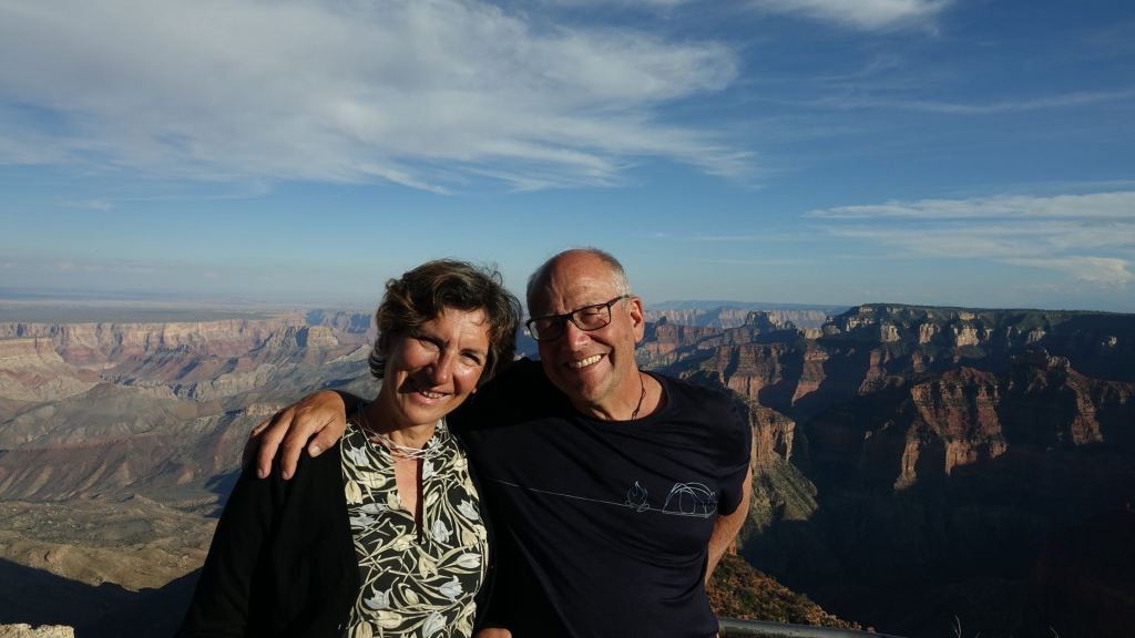 Ohne Zweifel: Der Grand Canyon, aber auch die vielen Canyonlandschaften der vergangenen Tage gehören zu den großartigsten Naturerscheinungen, die ich jemals gesehen habe. Da wird mir einmal mehr die Bedeutungslosigkeit meines kleinen Lebens, und sogar das der Menschheit insgesamt, bewusst. Hier drehen sich die Dinge über Jahrmillionen, dagegen ist die ganze Menschheitsgeschichte nur ein Wimpernschlag! Wir beenden den Canyonbesuch, der sich tief in meine Erinnerung graben wird, mit einem wunderschönen Sonnenuntergang am North Rim. Dann geht’s im Dunkeln die 45 Meilen zurück zum Hotel, wo wir zum Abschied von Brenda noch eine Flasche Rotwein auf der Terasse unseres Zimmers öffnen. Dann heißt es Abschied nehmen. Brenda wird morgen früh schon vor fünf Uhr aufbrechen. Am Freitag will sie wieder zuhause sein – ein ganz schöner Ritt. Sechs Tage sitzt sie im Auto, um fünf Tage mit uns zu verbringen. Diese Tage waren sehr intensiv und super organisiert, wofür wir uns sehr bei Brenda und Steve bedanken!
