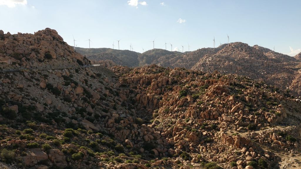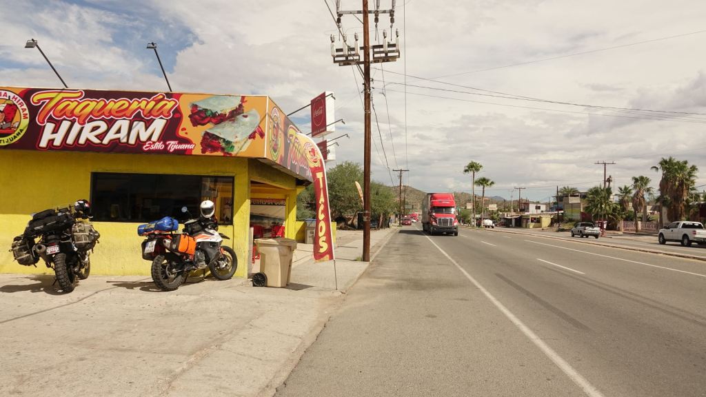 Direkt hinter dem Tor der Grenzstation betreten wir Tecate, eine sehr belebte Stadt mit unzähligen Geschäften, Restaurants, Bars und Spelunken. Zuerst ziehen wir uns an einem Geldautomaten Pesos, die wir anschließend in einem Restaurant einsetzen: Ensaladita Tropicana – sehr lecker! Danach bleiben uns noch gut drei Stunden bei Tageslicht, um etwas Strecke auf mexikanischem Boden gutzumachen. Dabei entfernen wir uns kaum mehr als 2-3 Kilometer von der amerikanischen Grenze, die uns etwa 400 Kilometer begleiten wird. Nach einer Stunde wird die Landschaft ganz plötzlich aufregend schön. Wir fahren in ein Gebirge, wie ich es noch nie gesehen habe. Es gehört zur Sierra Madre Occidental und besteht aus riesigen rundgeschliffenen Felsbrocken, die in loser Schüttung herumliegen, als hätte ein Riese mit Bauklötzen gespielt. Eine echt beeindruckende Kulisse, die sich uns hier bietet. Besonders ist auch die Abfahrt aus diesen Bergen in eine Tiefebene. In engen Kurven windet sich die Straße zu Tale, wobei es schnell wärmer wird. Unten angekommen sind es 38 Grad – puh!