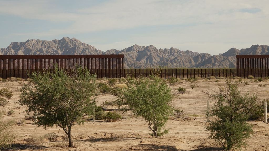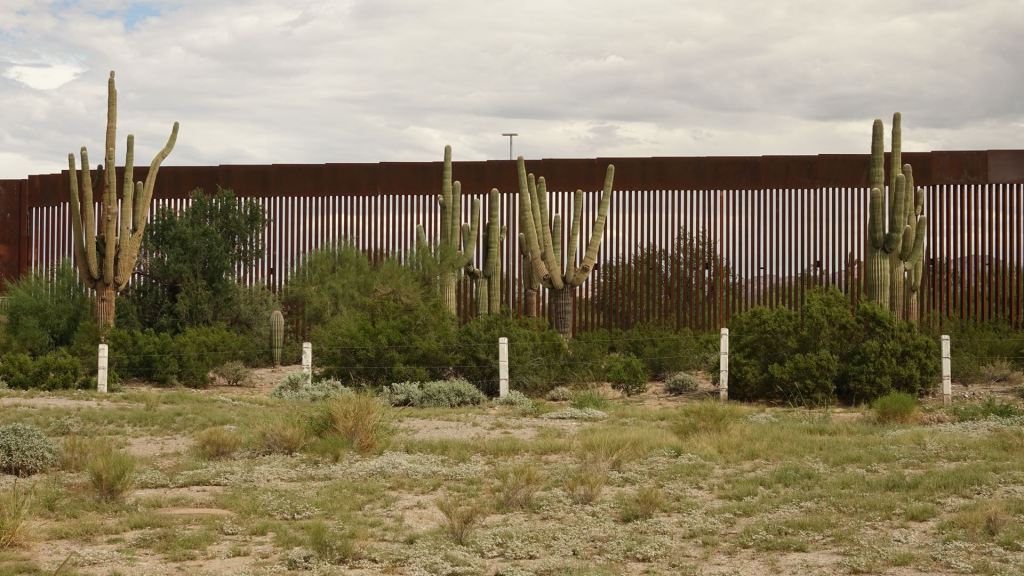 Etwas irritiert nehme ich zur Linken aus dem Gebirge kommend eine lange braune Linie war und brauche einen Moment, um mir darüber klar zu werden, was ich da gerade sehe. Na klar, das ist Trumps Mauer! Sie wird uns noch hunderte Kilometer begleiten! Was für ein Wahnsinn! Das hätte sich Walter Ulbricht auch nicht träumen lassen, dass er mal Vorbild für einen amerikanischen Präsidenten im 21. Jahrhundert werden würde. Auch wenn die Wirkrichtung dieser Mauer – eigentlich ist es ein Zaun – andersrum ist, so erinnert sie doch sehr an die Berliner Mauer. Sie erinnert mich aber auch an den riesigen Zaun, den die Chinesen 10 Kilometer vor ihrer Grenze auf tadjikischem Boden errichtet haben, dem ich 2018 über hunderte Kilometer entlang fahren durfte. Abschottung – ein neuer Zeitgeist?