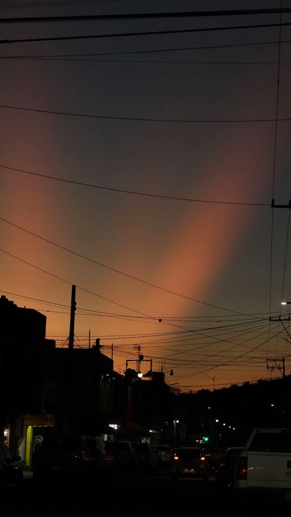 Es bleibt uns nach dem Einchecken noch etwas Zeit, im letzten Sonnenlicht die Stadt zu erkunden. In einer Kirche, deren Substanz schon ordentlich angegriffen scheint, können wir kurz einer Messe auf Spanisch folgen. Nach dem Sonnenuntergang leuchtet der Abendhimmel strahlenförmig am Horizont und verleiht der Stadt eine romantische Stimmung. Wir landen schließlich in einem Straßenrestaurant und beenden den Tag mit Burritos con Fricholes.