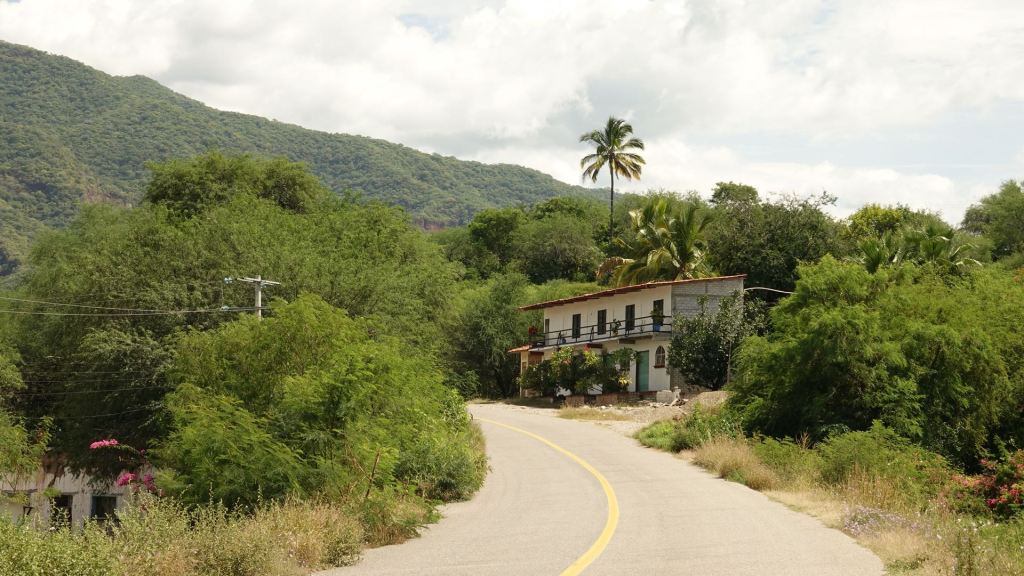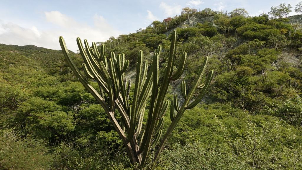 Am Sonntag geht es erstmals zu dritt auf Tour. Das klappt ganz wunderbar. Unsere Fahrstile passen gut zusammen – Opa like eben 😉 Bei Verlassen von Oaxata stellt uns das Wetter gleich auf die Probe. Noch bevor wir die Stadtgrenze erreichen, beginnt es aus Kübeln zu schütten. Die ganze Prozedur in die Klamotten zu steigen erfolgt im Dreck der Hauptstraße – wunderbar! Der ganze Zauber hält kaum 10 Minuten an. Das hätten wir besser abgewartet anstatt uns umständlich einzupellen. Denn jetzt grillt uns die Sonne unter der luftdichten Hülle. Also wieder anhalten und die ganze Prozedur wieder zurück! Am Ende erfreuen wir uns aber einer äußerst kurvenreichen Strecke durch traumhafte Landschaften, die je nach Höhenlage mal tropische, mal mediterrane Flora bietet. Ständige Aufreger bleiben die Schwellen in der Fahrbahn, die den Verkehr in den Ortschaften fast zum Erliegen bringen. Mit den Mopeds sind wir echt priviligiert. Eine Autofahrt würde wohl doppelt so lange brauchen. Auch heute begeistern mich die schönen Kakteen, die es besonders zahlreich in den Höhen oberhalb 1.200 Meter gibt.