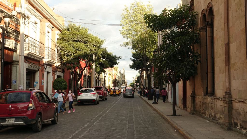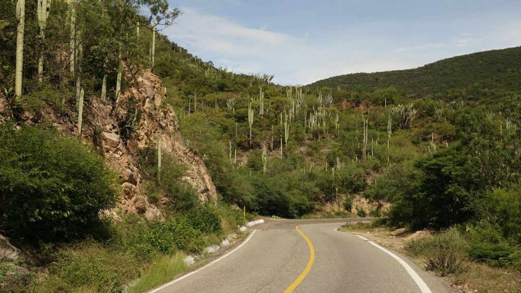 Heute kommen wir seit langer Zeit mal wieder in tiefere Höhenlagen und unterschreiten dabei sogar die Marke von 500 Metern. Dabei wird es unangenehm warm. Schöner Nebeneffekt hingegen ist der Wandel der Vegetation, die deutlich tropisch wird. Kakteen und Palmen tauchen auf. Überhaupt wird alles viel üppiger. Zum Glück geht es aber bald wieder bergauf, und wir erreichen Oaxaca am Nachmittag auf 1.550 Metern bei immernoch 28 Grad.