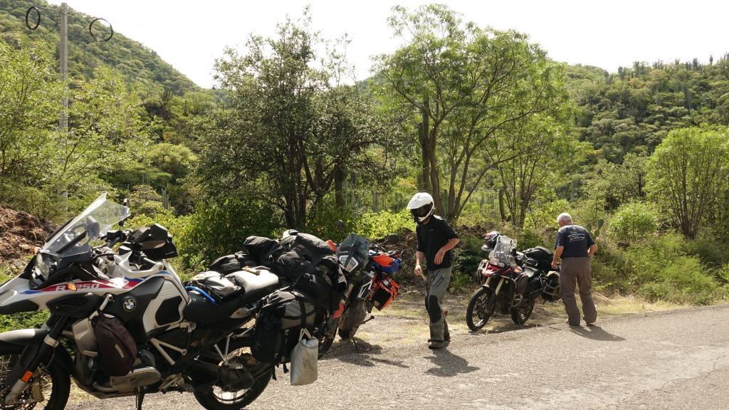Die Fahrt ist ein einziges Wechselbad der Temperaturen. Ständig schwanken wir zwischen 2.300 und 600 Metern. Im Gleichtakt schwanken die Temperaturen zwichen 22 und 35 Grad. Die amerikanischen Freunde verzichten da leichten Herzens auf die Schutzkleidung und schnallen die Motorradjacken auf das Gepäck. Das traue ich mich dann doch nicht. Die Straßen und die mexikanische Fahrweise bergen doch ihre Tücken.