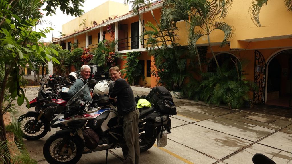 Wir quälen uns durch die verstopften Straßen dieser gar nicht mal kleinen Stadt und suchen als Treffpunkt mit Dave eine Straße mitten im Zentrum mit vielen Hotels. Zum ersten mal in Mexiko haben wir Schwierigkeiten ein freies Zimmer zu finden. Es ist Samstag und Oaxaca ein Feierort für viele Mexikaner aus dem Umland. Schließlich ergattern wir in einem schicken Hotel eine große „Habitacion“ mit zwei Räumen, die uns zu dritt reicht. Dave kommt kurze Zeit später auf seiner BMW 1250 GS angefahren. Er ist genauso sympathisch, wie ich ihn seit nunmehr zwei Wochen regelmäßig am Telefon erlebe. Die Stimmung im nunmehr Dreierteam ist von Anfang an prächtig. Steve und Dave haben beide einen großartigen Humor!
