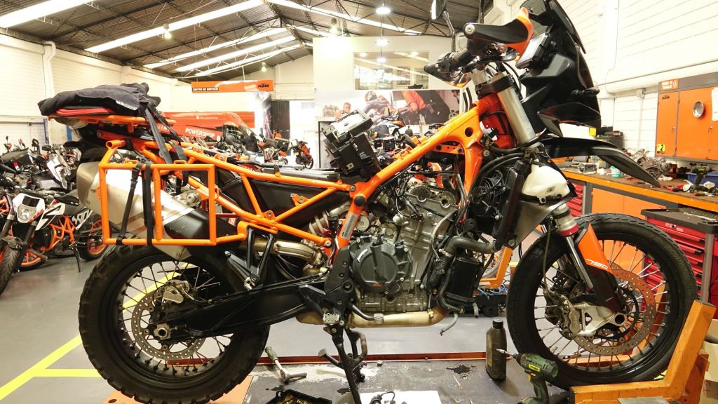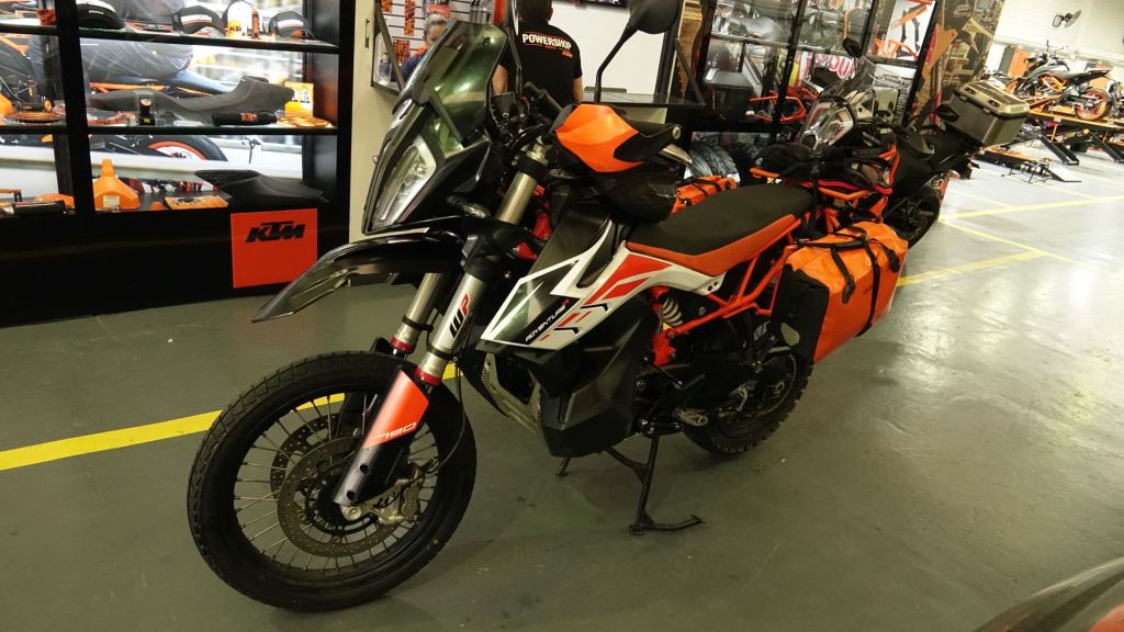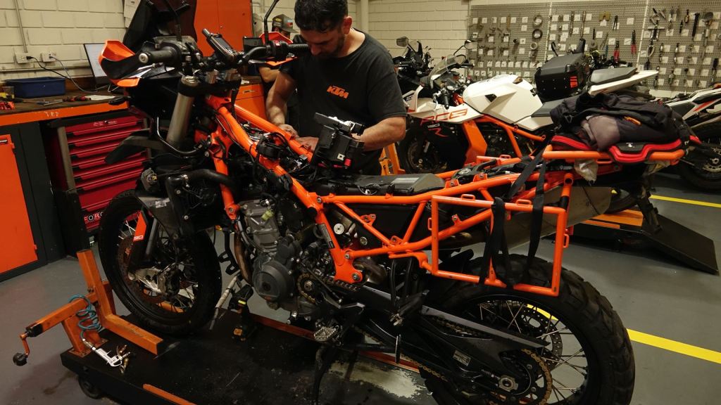 Ich werde gleich vom Werkstattmeister empfangen, der auf mein Kommen offensichtlich vorbereitet ist. Man schaut sich mein Moped gründlich an, prüft Lagerspiele, Kettensatz, Bereifung und Bremsen und kommt dann zum Schluss, dass neben dem großen Service incl. Ventilspielkontrolle auch noch die Bremsbeläge hinten zu tauschen, sowie das Lenkkopflager und die vorderen Bremsscheiben einzustellen seien. Bremsscheiben einstellen??? Wie soll das denn bitteschön gehen? Das wird mir dann später gezeigt! Dazu wird man mir eine neue Halterung für das beim Transport gebrochene Nummernschild basteln. Das klingt alles sehr gut und vertrauenserweckend. Anschließend wird mir Manuel vorgestellt, der von KTM auf das höchste Level „orange“ trainiert sei. Manuel ist mir auf Anhieb sympathisch. Sehr routiniert schraubt er die Maschine auseinander und bringt sie dann mit den demontierten Teilen in die Waschhalle, wo alles so intensiv gereinigt wird, dass das Moped wie neu aussieht. Ich schaue mir das ganze zunächst aus einem über der Halle gelegenen Warteraum an, der mir einen super Überblick über das ganze Geschehen gewährt.
