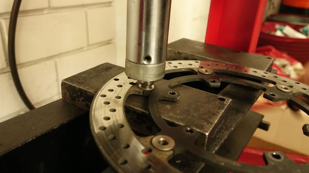 Mir war bis dahin gar nicht klar, dass das geht. Natürlich kenne ich das Phänomen, dass die Verbinder zwischen dem inneren und äußeren Teil der Bremsscheiben mit der Zeit etwas locker werden und die Scheiben beim Bremsen ein klackendes Geräusch machen. Irgendwann sagt einem dann der Service in Deutschland, die Scheiben müssen erneuert werden. Nicht so in Kolumbien! Die Scheiben werden demontiert und dann wird jeder Verbinder unter einer hydraulischen Presse soweit zusammengedrückt, bis er wieder fest sitzt. Eine Sisyphosarbeit, die eine Menge Gefühl braucht – ich bin wirklich beeindruckt!