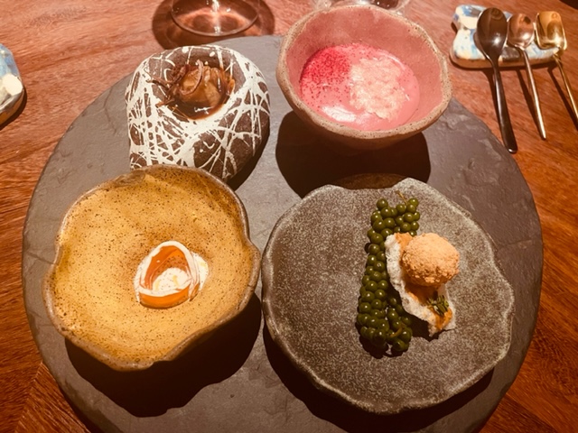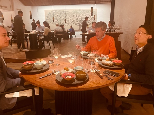 Am Abend sehe ich Humberto wieder. Dazu gesellt sich auch noch Caesar, ein weiterer Studienfreund. Mauricio lädt ins Leo ein, einem Restaurant, das in der San Pellegrino List der 50 besten Restaurants der Welt den 48. Platz belegt. Was uns dort erwartet, sprengt tatsächlich den Rahmen des bislang erlebten Restaurantspektrums. Ein einziges Festival für sämtliche Sinne mit Ausnahme des Hörens. Der kulinarische Genuß sei einmal vorausgesetzt, aber allein die Präsentation des Essens auf herrlichem handgetöpfertem Geschirr und auf wunderschönen Steinen lässt einen mit großer Ehrfurcht an das Essen heran gehen. Dazu die sehr ausgedehnten Erklärungen zu jedem der acht Gänge! Es mag nicht so richtig zum doch eher einfachen Reisestil passen, aber ich genieße jede Sekunde dieses tollen Abends mit Mauricio, Humberto und Caesar, die sehr unterhaltsam und witzig sind!