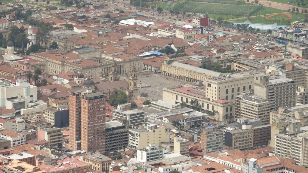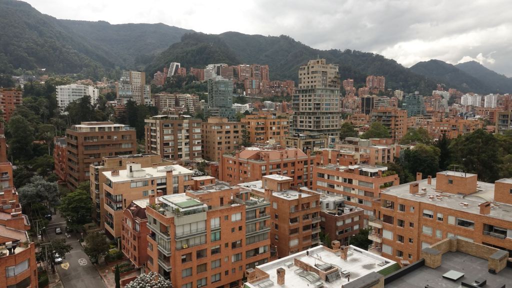 Nach dem fünften Gang war leider die Kapazität des Kameraakkus erschöpft, somit müsst Ihr Euch den Rest einfach vorstellen! Jetzt, am Freitagnachmittag, sitze ich in meinem schönen Zimmer in Mauricios Wohnung und bereite für morgen meine Abfahrt aus Bogota vor. Nach 10 Tagen fällt mir der Abschied sehr schwer. Zu schön war die lange Zeit, in der ich eine unglaubliche tolle Gastfreundschaft erfahren habe und mich von den langen Stunden auf dem Motorrad erholt habe. Die viele Zeit mit Mauricio, ein toller Gastgeber und ebenso guter Gesprächspartner, war ein besonderes Geschenk! Irgendwie bin ich in dem Viertel von Mauricio schon heimisch geworden. Hier liegt für ihn alles ganz nah zusammen, sodass ihm das nervige Autofahren in dieser Stadt erspart bleibt. Das Photo unten habe ich von seinem künftigen Büro aufgenommen. Das dunkelbraune Gebäude in der Mitte am linken Rand ist das Haus, in dem ich seit 10 Tagen wohne, Leonor wohnt gleich links unten, etwa 50 m außerhalb des Bildes, und der Bruder Ernesto nur 100 m weiter. Im Hintergrund die Berge, die Bogota im Osten begrenzen.