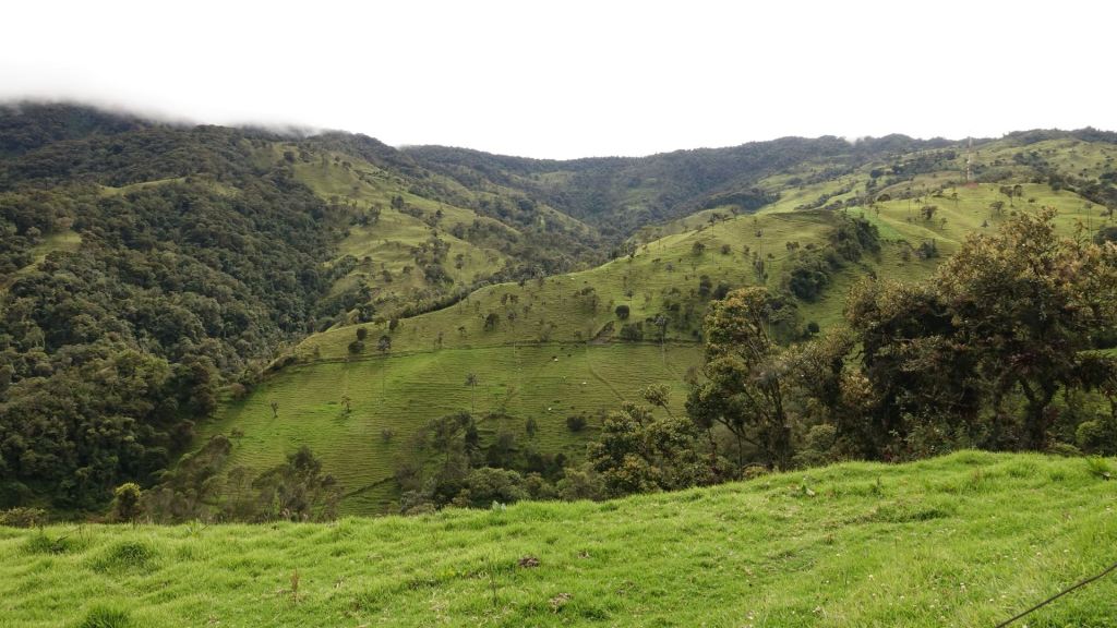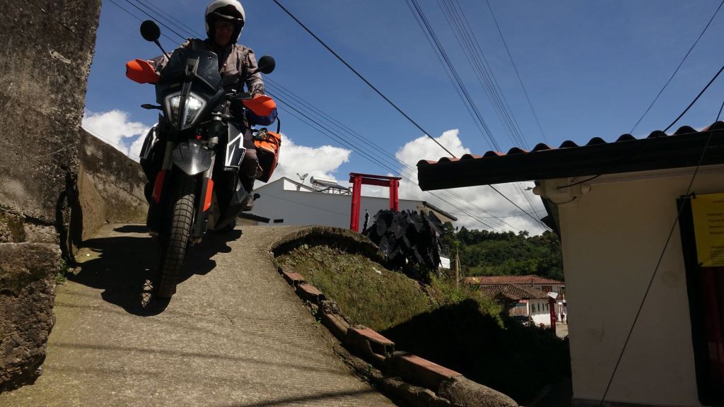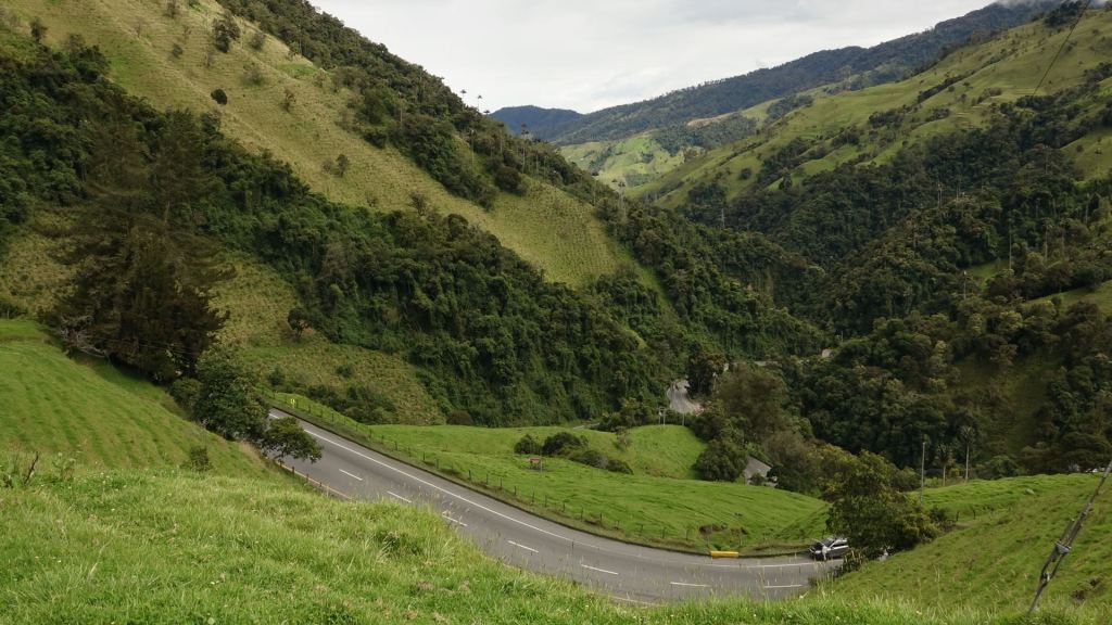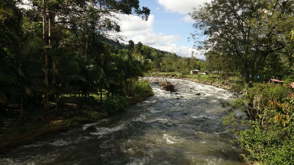 Am Montag, nach einem reichlichen Frühstück mit Arepas und Früchten, wollen wir Salento verlassen, doch offensichtlich habe ich am Vortag die Zündung zu lange eingeschaltet gelassen, um mein GPS zu laden. Außer mit einem Klacken beantwortet die Maschine mit keinem Ton das Drehen des Zündschlüssels. Ich bin noch nicht vom Moped abgestiegen, da schieben mich schon zwei Arbeiter, die flugs vom Gerüst des Nachbarhauses gestiegen sind, den Berg hinauf, damit ich es mit einem „Jump Start“ probieren kann. Unter ihrem Beifall und Gejubel klappt das auch auf Anhieb! Ich bedanke mich herzlich und finde mich alsbald auf der kurvigen Abfahrt durch den Regenwald, die ich diesmal sogar ohne Autoverkehr genießen kann. Dem Rio Quindio, den wir im Tal überqueren, wird es nach den gestrigen Regenfällen in seinem Bett fast zu eng. Dafür leuchtet alles in frischem Grün!
