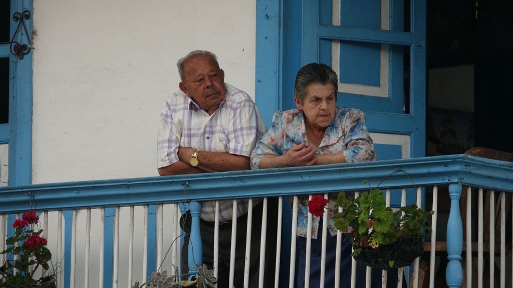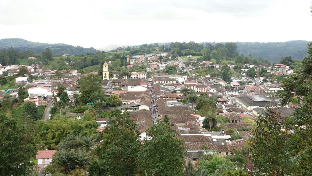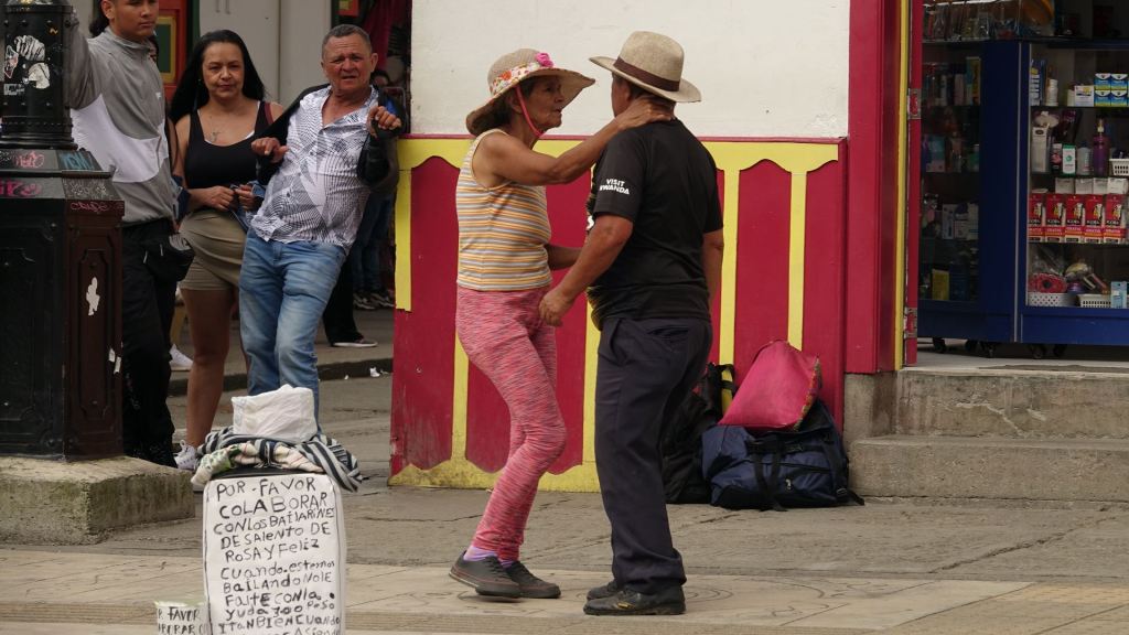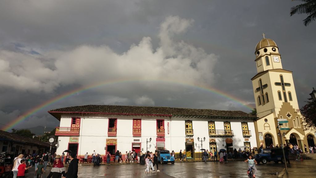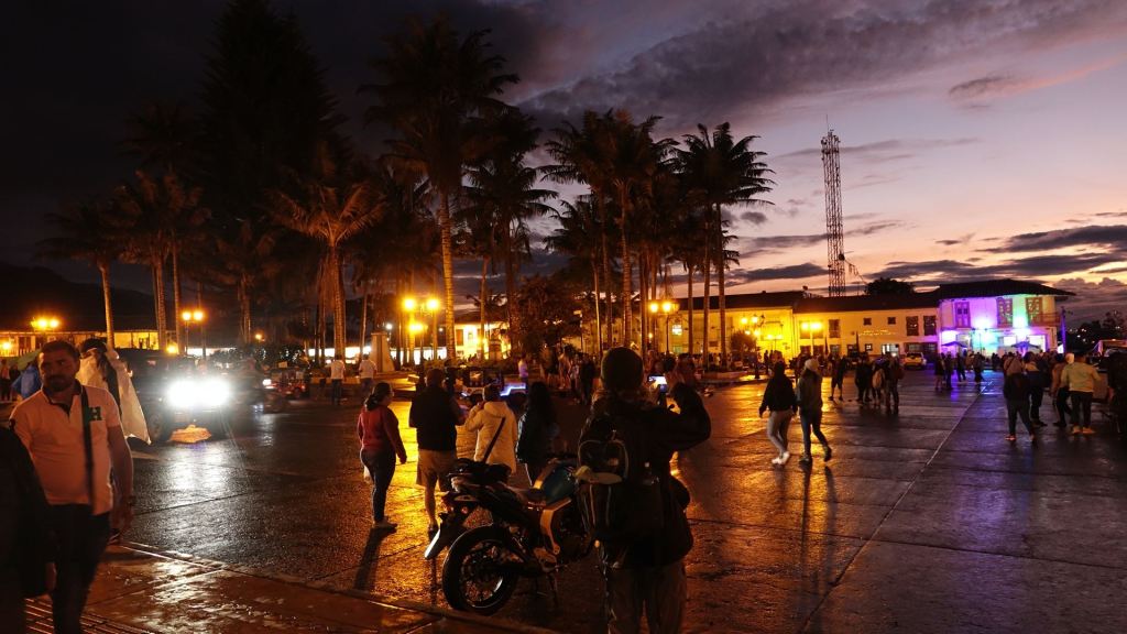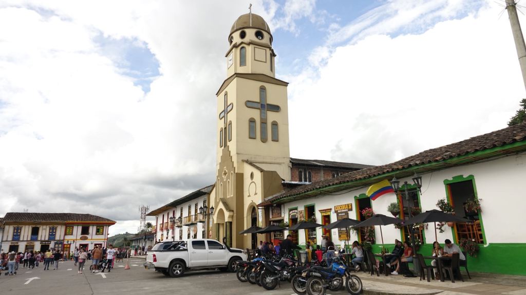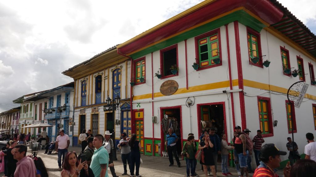 Der Ort Salento ist um die Plaza de Bolivar angeordnet. Hier tobt das Leben! Im Zentrum steht das Denkmal für Simón Bolivar inmitten eines hohen Palmenhains. Simón Bolivar wird bis heute in einigen Südamerikanischen Ländern, so auch in Kolumbien, als Befreier von der spanischen Kolonialherrschaft im 19. Jahrhundert verehrt. Gesäumt wird der Platz von zweigeschossigen, Häusern mit schönen, bunten Balkonen. Am heutigen Sonntag ist hier alles auf den Beinen, was in der Umgebung wohnt. Man flaniert in Großfamilie über den Platz, schleckt Eis, genießt Churros und schaut dem bunten Treiben auf der Plaza zu. Da werden Kinder in liebevoll gebastelten Autos für einen kleinen Obolus einmal rund um die Plaza geschoben, ein älteres Paar tanzt eng umschlungen und bittet um ein paar Pesos zum (Über) Leben und am anderen Ende läuten die Glocken der Kirche zum Messgang.