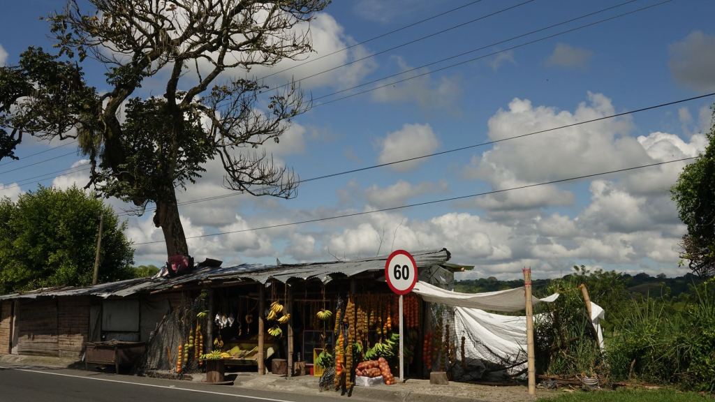 Steve und ich sind für gleich mit Dave und Wayne an einer Kreuzung in Armenia verabredet, um noch gemeinsam bis nach Cali zu fahren, bevor ich mich wieder ausklinken werde, um die Familie in Cali zu besuchen. Fast zeitgleich erreichen wir alle vier den verabredeten Ort und nehmen bei schönstem Sonnenschein – willkommenerweise irrt schon wieder der Wetterbericht – die knapp 200 km zur Hauptstadt der Provinz „Valle de Cauca“ unter die Stollen. Die Strecke ist landschaftlich nicht so aufregend, hat aber entlang des Straßenrandes viele Obst- und Gemüsestände, die in ihrer Farbenpracht sehr lieblich anmuten.
