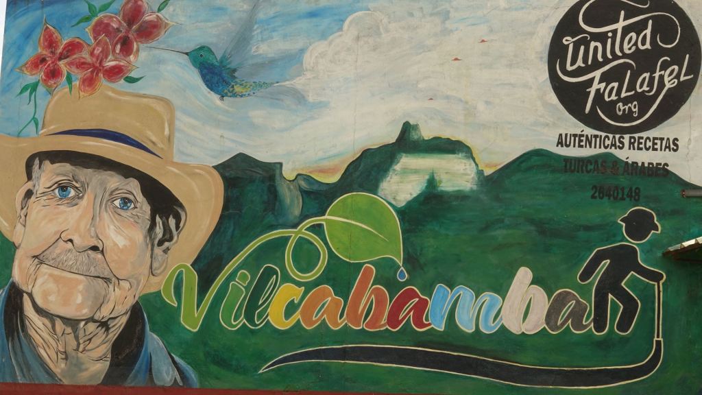 Ich selbst sehe bei meinem Besuch gar keine richtig alten Menschen in der Stadt, dafür umso mehr europäische und amerikanische Rentner in den siebzigern, die dem Ruf gefolgt sind, um hier ihren Lebensabend hoffentlich angenehm verlängern zu können. So geht es auch entsprechend beschaulich auf dem Platz vor der Kirche zu. Steve trifft dort Tom, einen Rentner aus seiner Heimat Ohio, der hier seit zehn Jahren lebt und sich der Ruhe und Stressfreiheit in Vilcabamba erfreut. Nicht ein einziges Flugzeug habe er in all den Jahren am Himmel gesehen. Eine Frau in traditioneller Tracht verkauft Obst, ein paar Kinder Spielen im Park und so manche Rentner sitzten auf den Terassen der Cafés. Ansonsten herrscht Ruhe und Frieden in diesem beschaulichen Ort.