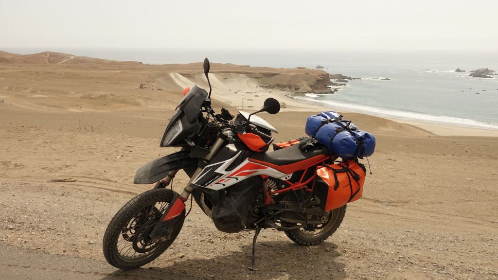 So spulen wir am Samstag und am Sonntag Vormittag einfach nur die Kilometer herunter. Links grauer Sand, rechts grauer Sand und manchmal ein kleiner Lichtblick in Form eines Strandes oder einer Bucht. Da hilft es sehr, dass ich gerade gelernt habe, wie ich mein Phone mit dem Helm verbinde und jetzt meine Playlists rauf- und runterhören kann. Ich habe eigens eine Panamericana Playlist erstellt! Eine weitere Playlist „für unterwegs“ kommt durch den Äther von Guido – sehr willkommen!
