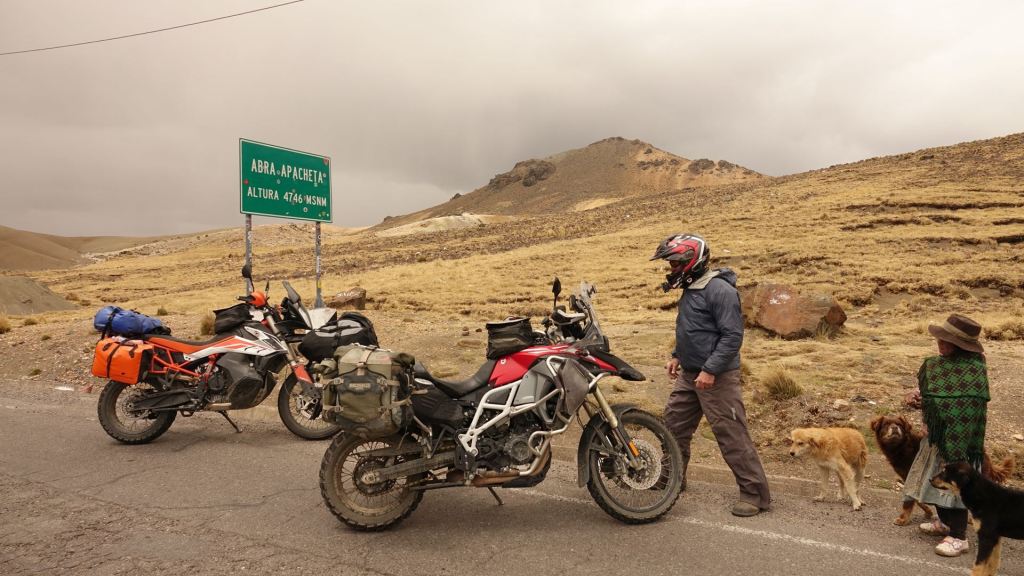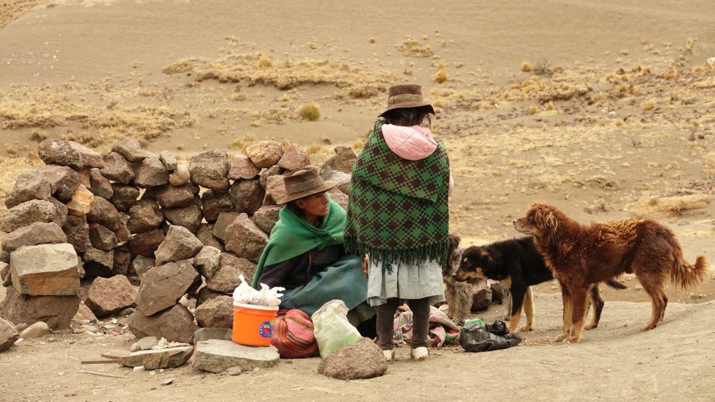 Auf dem Abra Apacheta angekommen, ist es sehr ungemütlich, denn es weht heftig und die Temperatur sinkt auf 5 Grad. Wir haben Mitleid mit der Nomadin und ihrer Tochter, die den äußerst selten vorbeikommenden Autofahrern ein paar getrocknete Maiskörner oder gestrickte Fingerwärmer anbieten. Meist ohne Erfolg! Wir kaufen nichts, aber Steve erbarmt sich einer Spende.