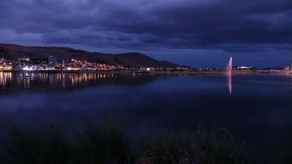 Die Suche nach einer Übernachtung gestaltet sich in Puno ziemlich schwierig, denn kein Hostal kann eine Unterbringung der Mopeds gewährleisten. Schließlich findet sich ein Hostal mit einem sehr netten und bemühten Besitzer, der die Nachbarschaft durch geht, bis er eine Dame findet, die unseren Mopeds Asyl in ihrem Hauseingang anbietet. Wir erkunden die Sadt während des Sonnenuntergangs mit mäßiger Begeisterung. Nicht einmal dem in die Stadt hineinreichenden Ufer des Titicacasees wurde eine schöne Uferpromenade gegönnt. Stattdessen ein vermüllter Geröllstreifen, in dem die Straßenköter ihr Unwesen treiben – schade! Aber auch vom hässlichsten Uferstreifen lässt sich schön auf den abendlichen See blicken, auf dem sogar zwei Fontänen in die Höhe schießen.