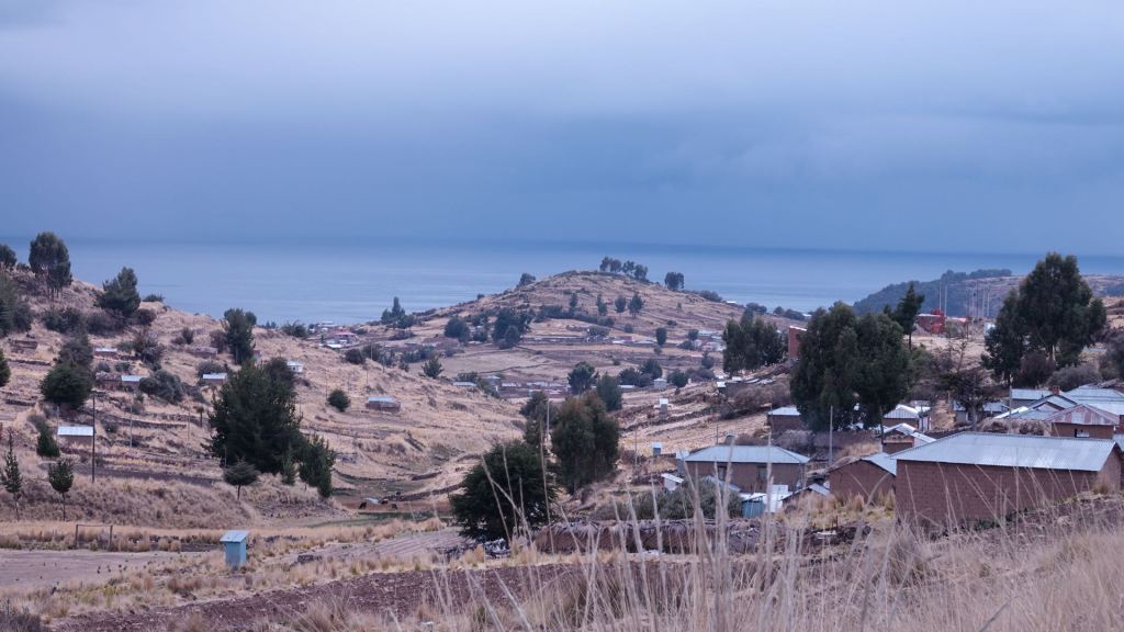 Einmal mehr staune ich auf den ersten Metern im neuen Land darüber, wie sehr sich durch eine künstliche Linie auf der Landkarte innerhalb von wenigen Metern und Minuten alles mögliche verändert. Die Straßen sind anders, die Menschen sehen auf einmal ganz anders aus, urplötzlich sind die Köter am Straßenrand total agressiv und rennen einem vor die Gabel, es riecht anders, die Fahrzeuge sind auf andere Weise schrottreif und mit großen Dachlasten beladen – kurzum: Wir sind wieder in einer anderen Welt! Nur der Blick auf den Titicacasee ist noch immer derselbe – tief blau und glatt liegt er eingerahmt von sanften Bergketten in der Abendsonne vor uns, ein beruhigender Anblick!