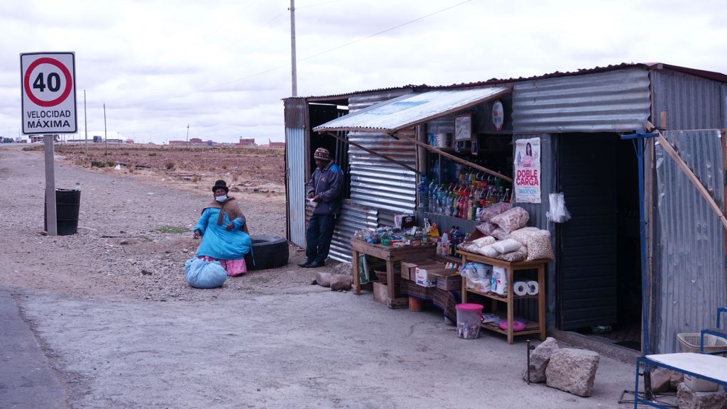 Nach Oruro müssen wir hineinfahren, weil es in Bolivien nur in den Großstädten Geldautomaten gibt, und an der Grenze konnten wir nur kleines Geld tauschen. Außer einem fürchterlichen Verkehr hat Oruro aber nichts zu bieten. Selbst die Suche nach einem Mittagessen hätten wir beinahe erfolglos aufgegeben, wäre nicht in letzter Minute doch noch ein Chicken-Imbiss aufgetaucht. Eine der rar gesähten Tankstellen finden wir auch noch bei der Ausfahrt aus der Stadt. Auswahl gibt es keine; man hat nur eine Sorte Benzin! Welche Qualität diese hat, kann man mir nicht verraten – au Weia! Mit ungutem Gefühl schütte ich das Zeugs in den Tank und hoffe, dass sich das nicht rächen wird. Vor dem Tanken werden wir freundlicherweise noch drauf aufmerksam gemacht, dass die 3,74 Bol je Liter, die an der Zapfsäule stehen, nur für Einheimische gelten. Als „Extranjero“ sind 9,41 Bol zu berappen. Das ist in Ordnung, denn warum soll der bolivianische Steuerzahler uns Touristen den Sprit subventionieren?