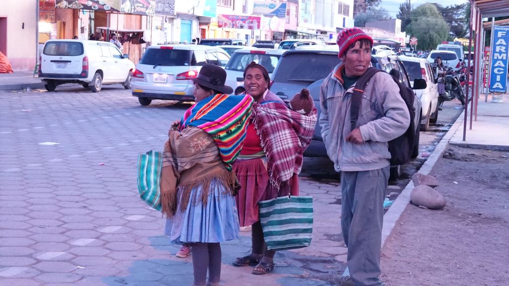 So erreichen wir etwa eine Stunde vor Sonnenuntergang das Örtchen Challapata, einer der wenigen Orte, die nicht direkt an der Hauptstraße, sondern etwas abseits liegen. Deswegen haben wir ihn zum Übernachten ausgewählt. Denn dann gibt es auch, anders als in den trostlosen Straßendörfern, einen zentralen Platz, an dem man flanieren und zu Abend essen kann. Am meisten Spaß aber bereitet das Beobachten der vielen interessanten Gestalten und Gesichter, die es dort zuhauf gibt! Die Unterkünfte werden hier in Bolivien immer spatanischer, aber das spielt für uns keine Rolle. Es schläft sich auch im einfachsten Zimmer gut, solange die Bettwäsche OK ist!