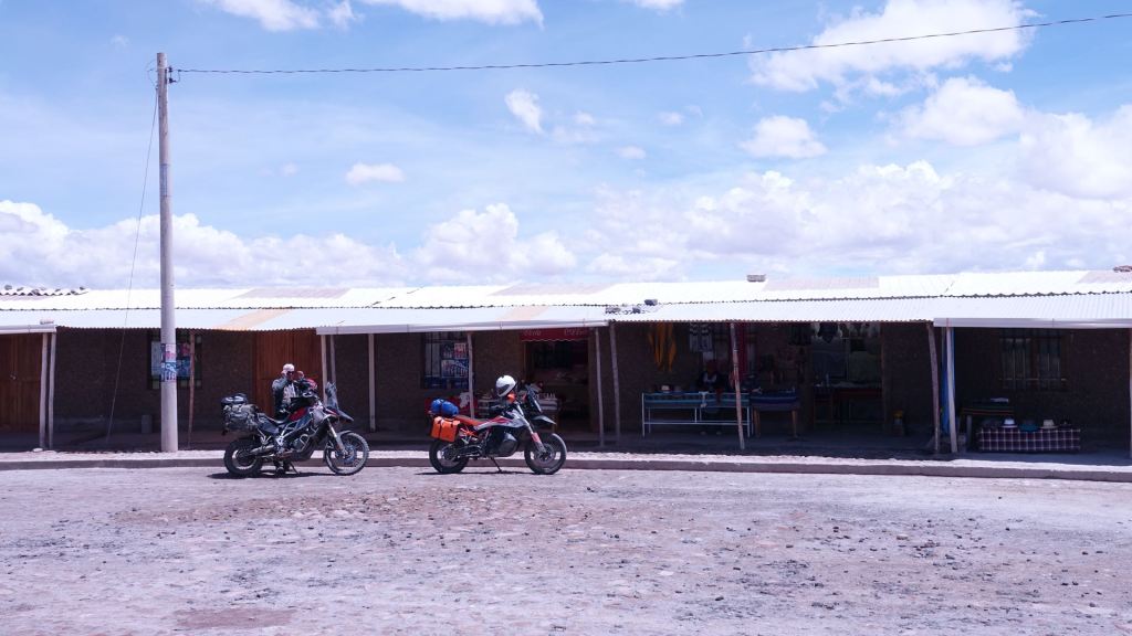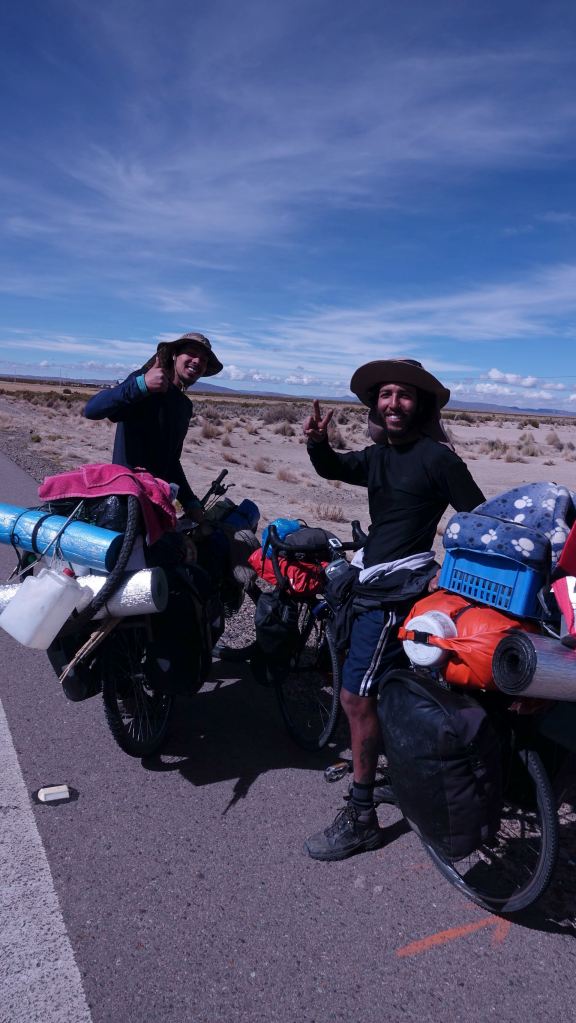 Nach einer Stunde Fahrt erblicke ich am Horizont zwei schwer beladene Radfahrer und erkenne beim Näherkommen an einem der Räder die kolumbianische Flagge. Wir begrüßen Stiven und Santiago aus Medillin. Sie sind bereits seit einem Jahr unterwegs und wollen irgendwann auch in Ushuaia ankommen – es ist ein anderer Zeitmaßstab als mit mit dem Motorrad! Schon gestern haben wir mit Tine und Jan zwei Radfahrer aus Belgien getroffen, die erst von Belgien über die Türkei in den Iran und weiter bis nach Kasachstan gereist sind und dort einen Flieger nach Lima genommen haben, um ihr Sabatical in der Winterzeit (im April) auf der Südhalbkugel zu beenden – irgendwie ein cooler Plan!