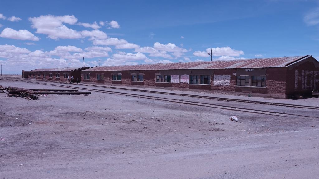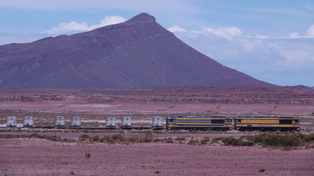 Je mehr wir uns dem Salar de Uyuni – dem mit 10.000 qkm größten Salzsee der Erde – nähern, desto mehr fällt auf, wie die Oberfläche der Berge in den Farben wechselt. Mal ist es ein tiefes Rostrot, was auf Eisen schließen lässt, dann wieder ein blasses Grün, das auf Kupfer deutet. Kein Zweifel: Dieses Land ist reich an Bodenschätzen, und diese werden erbarmungslos ausgebeutet. Deswegen begleitet uns auch schon die ganze Zeit ein einsames Bahngleis, dass nur sehr selten von einem Zug befahren wird. Wir werden Zeuge eines dieser wenigen Transporte von Lithium. Die Transportbehälter sind wohl so schwer, dass nur jeweils einer direkt über dem Drehgestell eines Wagons transportiert wird. Das ganze bewegt sich im Schneckentempo von geschätzten 20-30 km/h. Im Norden von Chile und im Süden Boliviens werden die größten Lithiumvorkommen unserer Erde vermutet, und der Batteriehunger unserer Gesellschaft macht dieses Halbmetall zu einem kostbaren Gut, das insbesondere dem armen Bolivien jüngst zu ungeahntem Reichtum verhilft!