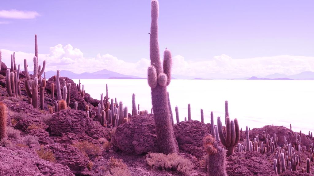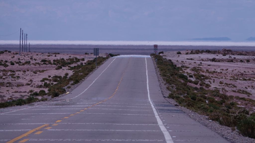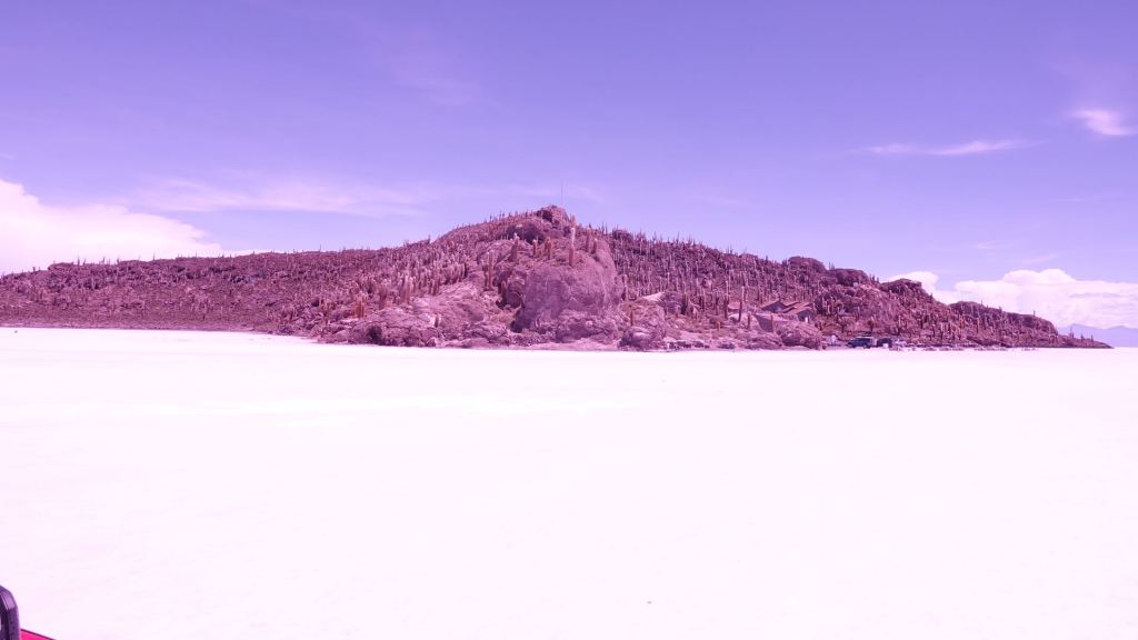 Kurz vor der Mittagszeit taucht vor uns – einer Fatamorgana gleich – ganz verschwommen ein weißer Streifen auf. Das ist der Salar de Uyuni. Ein gigantischer Anblick! Auf diesen wollen wir hinauf, und zwar etwa 75 km weit bis zur „Isla de Inkahuasi“.
