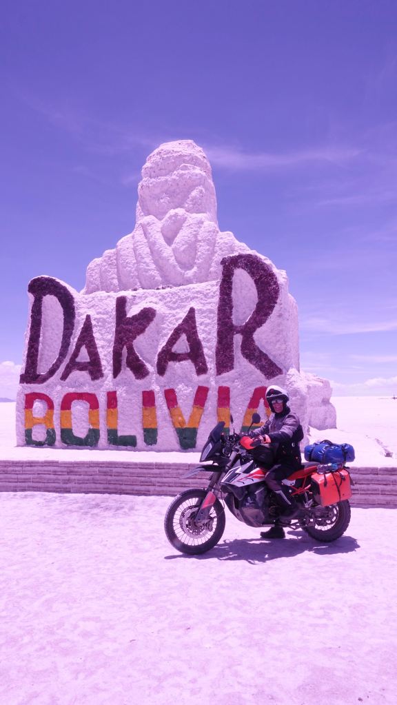 So gestärkt und ausgerüstet begeben wir uns über eine 5 km lange salzig-lehmige Piste auf den Salar, der beim Einstieg ein wenig matschig ist, dann aber eine perfekt ebene Fahrbahn bietet, auf der es sich spielerisch mit 80-90 km/h fahren lässt. Viele Wege führen nicht nur nach Rom, sondern auch über den Salar zur Isla de Inkahuasi. Egal welchen Spuren man auch folgt, am Ende vereinigen sich alle wieder vor dieser einzigartigen Insel. Unterwegs treffen wir nach 10 km auf das Dakar Monument, eine riesige aus Salz bestehende Touareg-Statue, die 2016 anlässliche der Rally Parias-Dakar, die in dem Jahr in Bolivien ausgetragen wurde, errichtet wurde.