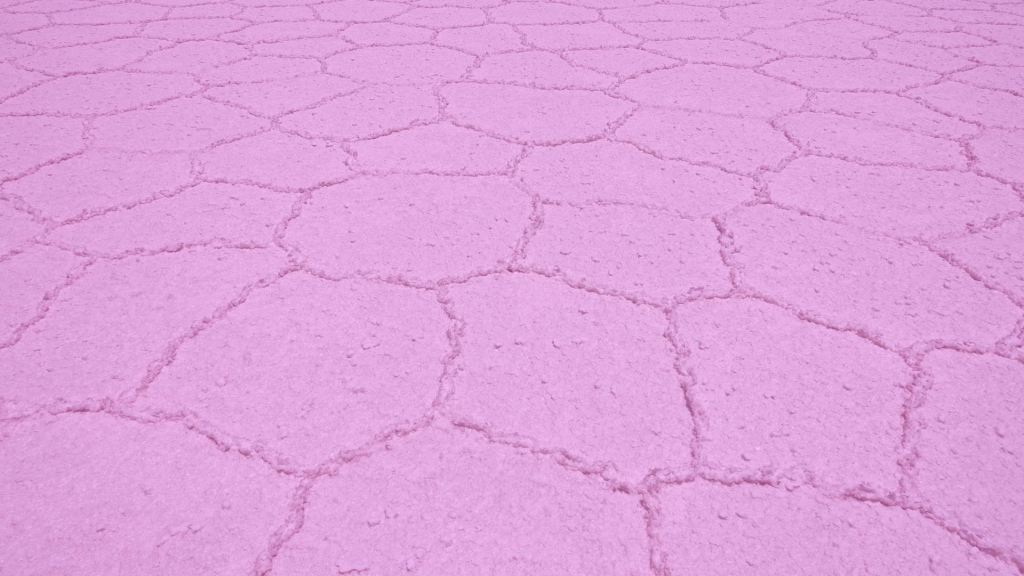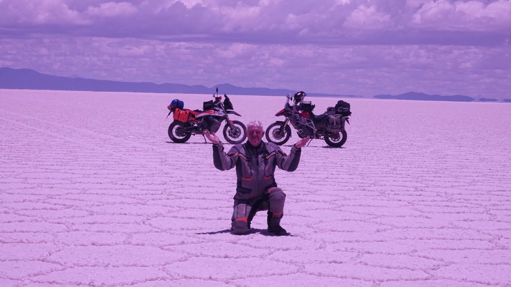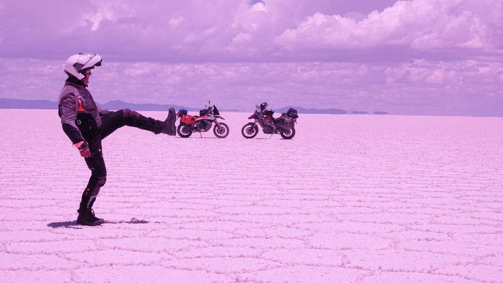 Ab dem Dakar Monument sind wir dann, abgesehen von den Spuren, ohne Orientierungshilfe auf dieser unglaublich großen, ja schier unendlichen, weißen Fläche unterwegs. Da bieten sich ein paar witzige Photos mit optischer Täuschung an. Interessant, wie auch hier die Physik wieder zuschlägt. Ähnlich wie eine ausgetrocknete Lehmfläche, oder wie die einzelnen Schaumbläschen in der Badewanne, oder dem Spülbecken, bricht auch die Salzfläche in nahezu perfekten Hexagons auf. Allerdings sind diese deutlich größer als bei einer aufgebrochenen Lehmfläche – etwa 80 cm im Durchmesser! Außerdem sind die Linien keine Risse, sondern Aufwerfungen von Salz.