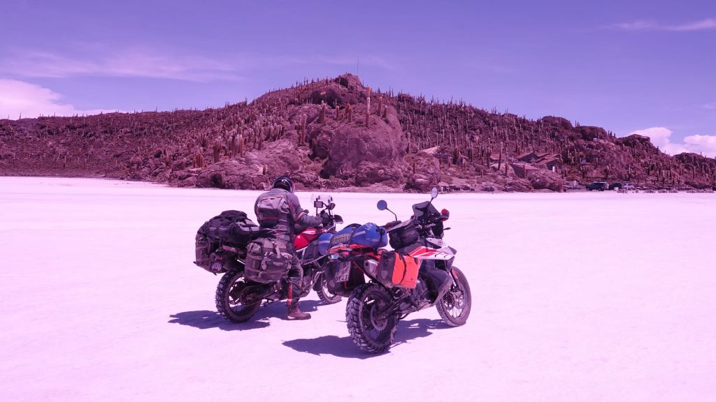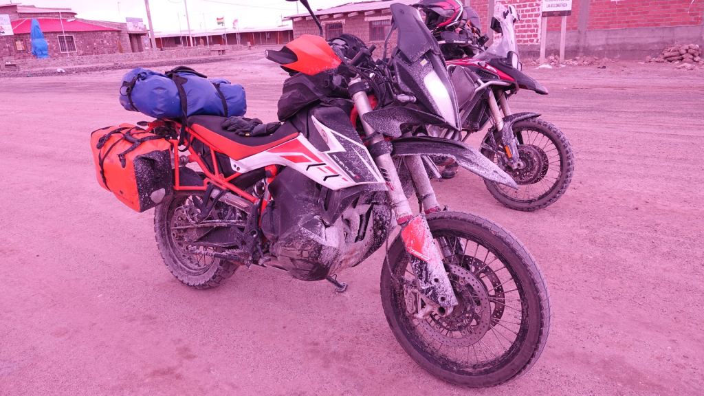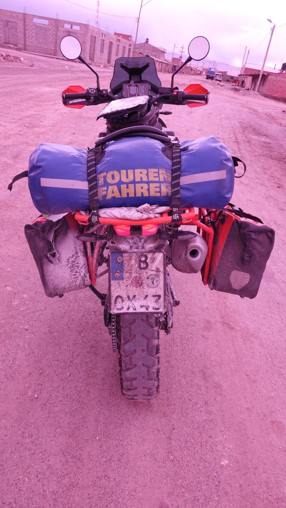 Auf dem Rückweg folgen wir einer anderen Spur in der Hoffnung, eine trockenere Strecke zu finden, doch das Gegenteil ist der Fall. Über weite Teile fahren wir über nasses Salz, wobei es erstaunlich ist, wieviel Halt diese nasse Oberfläche bietet. Keinerlei Geschmiere, wie auf nassem Lehmboden, der uns morgen noch viel „Freude“ bereiten wird! Kurz vor Colchani, in etwa auf der Höhe des Dakar Monuments wird es dann so dunkel und stürmisch, dass wir uns schon auf das schlimmste einstellen. In krasser Schräglage fahren wir geradeaus, und ich bin froh, dass der Salzuntergrund so griffig ist! Ein paar Tropfen bekommen wir auch ab, lassen uns davon aber nicht einschüchtern und fahren einfach weiter. Bei dem Sturm wäre das Anziehen der Regenklamotten eh ein lustiges Unterfangen geworden. Der Mut wird belohnt: Wir erreichen Colchani ziemlich trocken und bestaunen das Salzkleid unserer Mopeds.