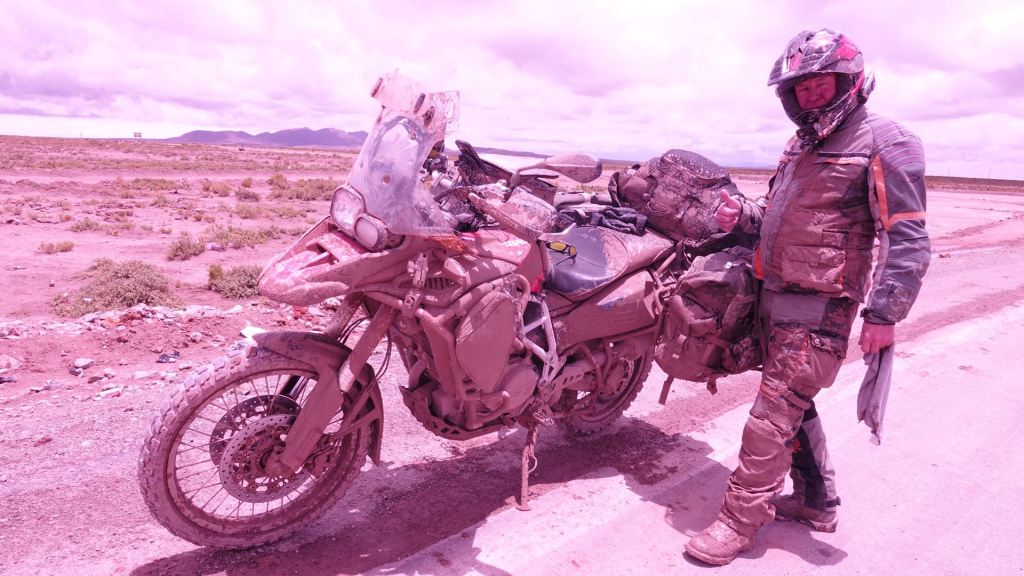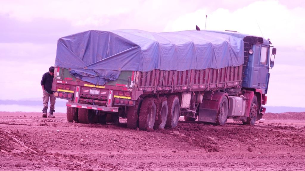 Es gibt eigentlich nur einen Straßenzustand – mal abgesehen von Schnee – in dem ein Motorrad dem Auto klar unterlegen ist. Das ist lehmiger Matsch! Zwar habe ich damit in all den Jahren des Motorradreisens schon einige Erfahrung gesammelt, aber so krass und über eine so weite Strecke wie am heutigen Freitag habe ich eine Matschfahrt noch nie erlebt! Es beginnt schon in der Stadt Uyuni, die nach weiteren Regenfällen in der Nacht vollends geflutet ist. Nachdem das Moped heute mal ohne Starthilfe anspringt, schleusen wir uns durch die erdigen Straßen – eine schöne Schlammschlacht. Am Ortsausgang wird noch getankt. Heute will man von uns 6 Bolivar je Liter, statt der 3,74 Bolivar für die Einheimischen. Das ist deutlich weniger als beim letzten mal und lässt vermuten, in wessen Taschen die Differenz fließen wird. Nach dem Tanken wird Starthilfe benötigt. Der Motor springt unwillig an und stirbt alsbald wieder ab. Das klingt nicht gut. Auch beim zweiten Versuch will der Motor nicht weiter laufen. Was ist das für ein Gebräu, das dort aus der Tanksäule kam? Nach dem dritten Versuch hat sich das Moped offensichtlich an den Sprit gewöhnt, jedenfalls läuft der Motor nun rund und bleibt an.