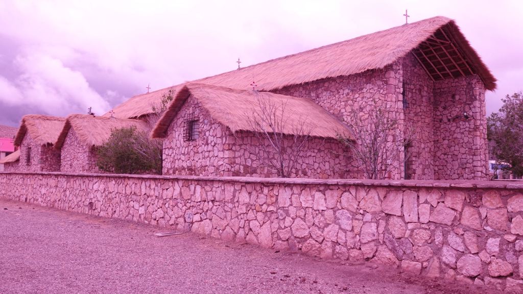 Nach 65 Kilometern des Schwitzens und Zitterns traue ich meinen Augen nicht. Ist das da vorne eine Fatamorgana, oder wirklich Asphalt? Die Karte hat davon nichts gesagt, aber tatsächlich, der Belag wechselt in schönsten Asphalt! Selten habe ich mich so sehr darüber gefreut wie jetzt – so eine Erleichterung! Es bleibt mir ein Wunder, wie wir die Strecke ohne Sturz geschafft haben! Über 50 Kilometer genießen wir die perfekte Straße und lassen uns nicht einmal vom aufkommenden Regen stören – Hauptsache die Räder haben wieder Grip! In San Christobal wollen wir zu Mittag essen, doch hier gibt es nichts, kein Restaurant und kein Hostal. Einzig interessant ist die Naturstein-Kirche, die 1998 vom urspünglichen Ort um 8 km hierhin versetzt wurde, da der alte Ort einer Mine weichen musste. Das neue San Christobal wurde erst im Jahr 2000 eingeweiht.