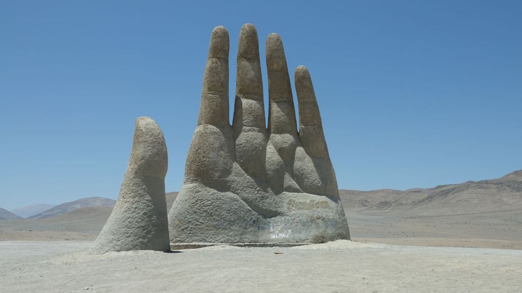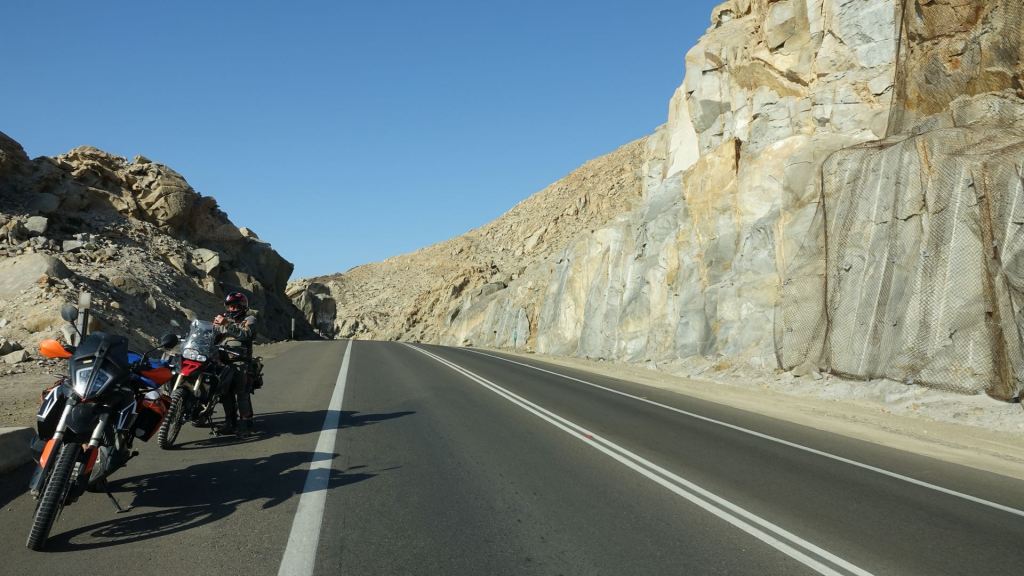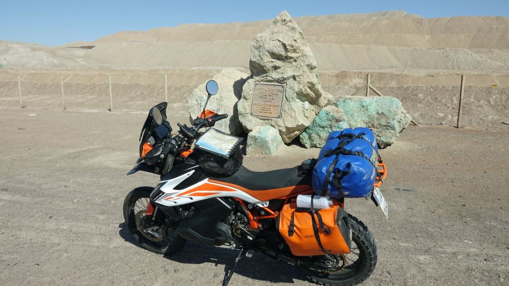 Um 11 Uhr am Dienstagmorgen bekomme ich mein Moped mit frischer Batterie, die nun nachweislich 229 Amp Startstrom liefert, zurück. Dazu wurde die Kette gepflegt und der Kühlerfrostschutz aufgefüllt. Ich zahle umgerechnet 350.- US$ und bin glücklich! Danach geht es wieder auf die Ruta 5 in Richtung Süden. Es bleibt beim alten Bild: Geröll und Minengelände. Dazu viele LKW, keinerlei Flora und auch keine Fauna. Dafür aber nur 75 km hinter Antofagasta ein besonderes Kunstwerk „La Mano del Desierto“ vom chilenischen Bildhauer Mario Irarrázabal. Das ist eine mehr als 10 m hohe Hand, die dort aus einem Felsen gehauen wurde – ein beeindruckender Anblick und anatomisch nicht schlecht getroffen! Direkt neben dem Kunstwerk treffen wir auf einer 250-er Honda mit peruanischem Kennzeichen Richard aus England. Er hat das Moped 2018 in Peru gekauft und reist damit mittlerweile im fünften Jahr jeweils 3-4 Monate im Winter durch Südamerika. Damit überbrückt er, der im Baugewerbe tätig und somit im Winter ohnehin beschäftigungslos ist, die ungemütliche Jahreszeit und tauscht England gegen Länder wie Peru, Bolivien, Chile oder Argentinien ein. So kann man’s auch machen!