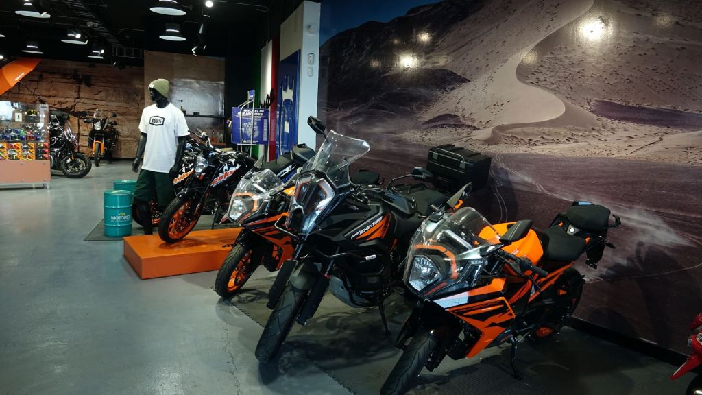 Der Shop ist nicht groß, wirkt aber sehr aufgeräumt und huldigt dem Corporate Design der Österreicher. Am Tresen begrüßt mich Jair und hört sich geduldig mein Leid an, um mich dann wissen zu lassen, dass der Mechaniker gerade einen Einsatz auf der Straße habe und erst gegen 14 Uhr zurück komme. Tatsächlich dauert es aber gar nicht so lange, denn schon eine Stunde später erscheint Lucas und nimmt mein Moped in die Werkstatt. Wo diese wohl sein mag, habe ich mich bereits die ganze Zeit gefragt, weil ich im Umfeld des Shops nichts sehen konnte. Die Antwort liegt im Hemd, das Lucas trägt. Dieses trägt nämlich die Insignien einer von mir wenig geschätzten amerikanischen Motorradmarke: Harley Davidson! Im gleichen Gebäudekomplex ist tatsächlich auch ein Harley-Shop untergebracht, und deren Werkstatt und Personal nutzt auch KTM. Lucas zeigt mir aber ganz stolz sein Zertifikat von KTM, das ihn als qualifizierten Mechaniker für das gesamte KTM-Programm ausweist!