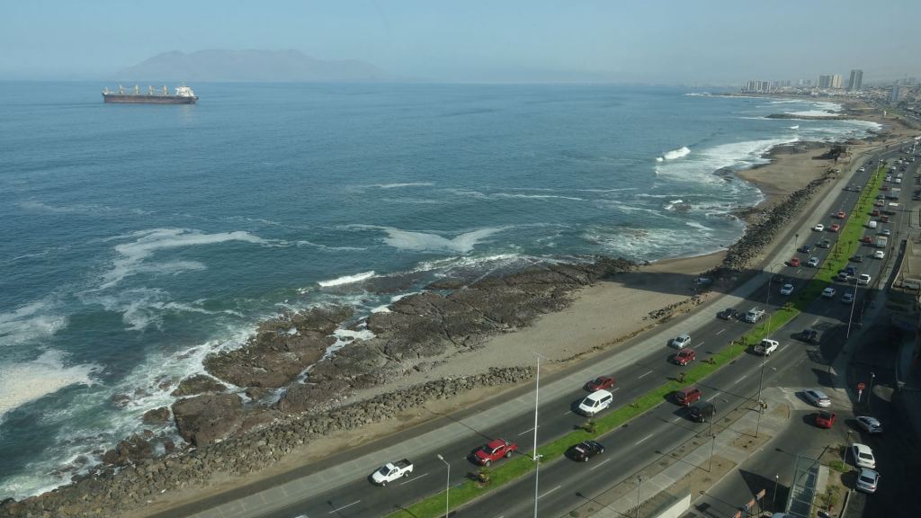 Die Atacama ist mit durchschnittlich 0,5 mm Niederschlag im Jahr die trockenste Wüste dieser Erde; viele Orte in der Atacama haben bereits seit 23 Jahren keinen Tropfen Niederschlag bekommen! Sie ist aber zugleich auch eine recht kühle Wüste. Als wir San Pedro de Atacma schon um halb sieben in der Früh verlassen, zeigt das Thermometer gerade mal 8 Grad. Bis Calama wird es nicht viel wärmer. Erst danach arbeitet sich die Sonne auf bescheidene 19 Grad hinauf, die bei Ankunft um 11 Uhr in Antofagasta anliegen. Der Weg bis nach Antofagasta ist ziemlich langweilig. Geröllwüste ohne Ende! Allein die riesigen künstlichen Berge, die durch den Abraum der Minen aufgeschüttet wurden, lassen einen staunen. Es sind oft mehrere hundert Meter hohe und einige Kilometer lange Erhebungen, die sich direkt an die natürlichen Berge anschließen. Gigantische Kipper schütten reihenweise den Abraum die Hängen hinunter, was aus der Ferne einer Ameisenstraße gleicht.