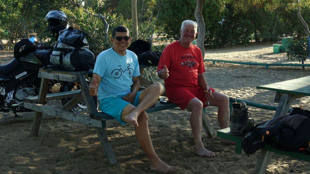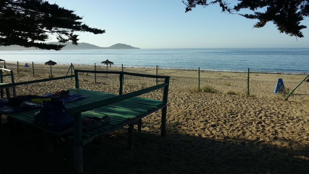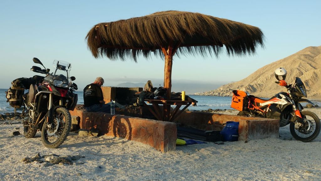 In Vallenar halten wir zum Tanken sowohl der Mopeds als auch unserer Mägen. Vor dem Straßenrestaurant steht eine vollkommen überladene Suzuki V-Strom aus Kolumbien. Sie gehört Walter Rivera aus Cali, der erst vor 13 Tagen zuhause losgefahren ist (6.500 km), um morgen in Santiago bei der Schwiegermutter in Santiago einzutreffen, wo er mit der ganzen Familie Weihnachten und Neujahr feiern will. Seine Frau wird auch einfliegen. Walter wirkt recht einsam und ist sichtlich erfreut, uns hier zu treffen. So schließt er sich uns an und weiß noch nicht, dass dies in seiner ersten Nacht im Freien enden wird. Hinter Coquimbo finden wir nämlich an der Playa de Herradura einen verlassenen Campingplatz direkt am Strand, auf dem es wunderbar gebaute Holzterrassen unter Bäumen gibt, die eine perfekte Basis für Isomatte und Schlafsack bieten. Walter ist ganz aufgeregt und fragt, ob man denn hier schlafen könne, ohne dass das Moped geklaut oder man überfallen werde!