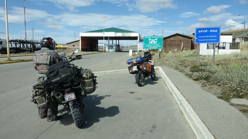 Absolut begeistert von dem gerade Erlebten machen wir uns auf die 15 km lange Piste zurück zur Kreuzung. Diesmal erwischt es uns von links! Aber auch auf Schotter bleiben die Reifen in der Spur, und eine knappe halbe Stunde später sitzen wir entspannt im Sattel und lassen uns wieder vom Wind schieben. An der Grenze ist es schließlich so stürmisch, dass wir Schwierigkeiten haben, die Mopeds abzustellen. Da ist das Fahren fast einfacher als das Stehenbleiben! Die chilenischen Grenzformalitäten dauern gerade mal eine Minute! 15 km weiter brauchen wir ganze 5 Minuten, um beim Argentinier eingelassen zu werden – so schön kann das gehen! (Kleiner Hinweis an die Kollegen in Nicaragua, Guatemala, El Salvador, etc.!)