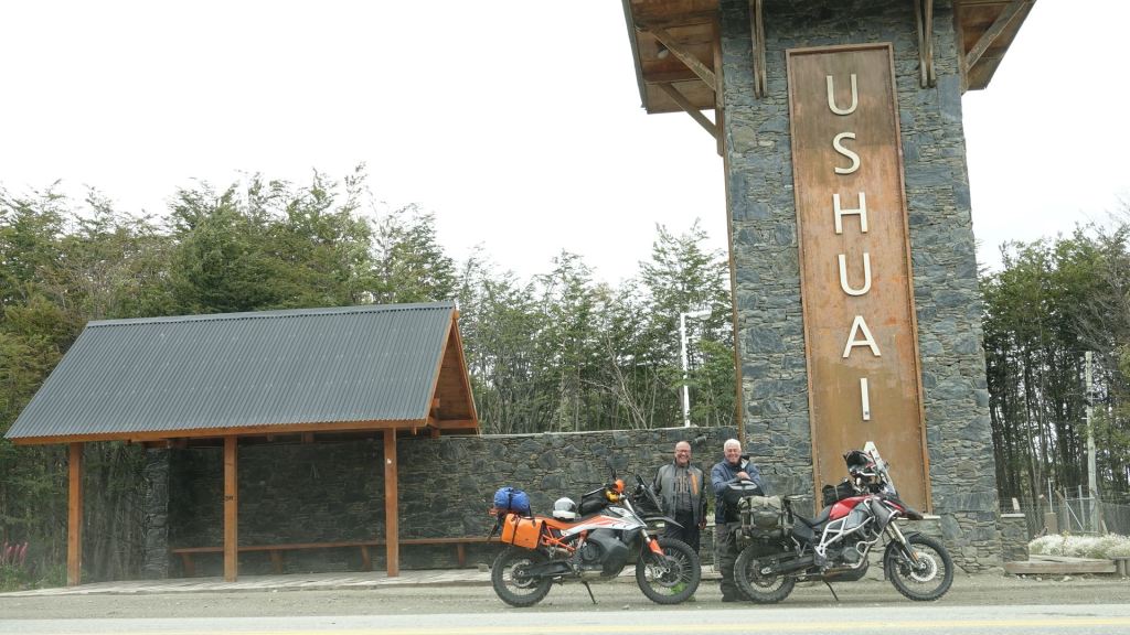Am Mittwoch wachen wir unter starkem Regengeprassel auf. Die Tropfen fallen nicht, NEIN, sie fliegen durch die Luft. Etwas lust- und auch mutlos packen wir uns in die Regenklamotten und machen uns dennoch auf den Weg, denn hier wollen wir nicht noch eine Nacht verbringen. Der Wind steht aber wieder günstig, sprich er trifft uns im Rücken bis wir nach 110 km in Tolhiun einen Tankstopp einlegen. Meine Finger sind bei 3 Grad mittlerweile in den durchnässten Sommerhandschuhen komplett eingeforen, da hilft auch nicht die Freude über die niedrigen Spritpreise, die bei 35 Cent pro Liter 95 Octan-Benzin liegen! Ein heißer Cacao aber schon! Mit wasserdichten Handschuhen, die mir Steve leiht, überstehe ich die zweite Hälfte der Tagesetappe dagegen sehr gut, und kurz vor Ushuaia lässt sich dann sogar die Sonne etwas blicken. Das erlaubt uns, bei Einfahrt nach Ushuaia doch noch das unvermeidbare Photo an den Türmen des Stadttores der südlichsten Stadt dieser Erde zu schießen. Wir haben es geschafft! Alaska – Feuerland ist nunmehr Geschichte! Wie fühlt es sich an? NORMAAAL!!!