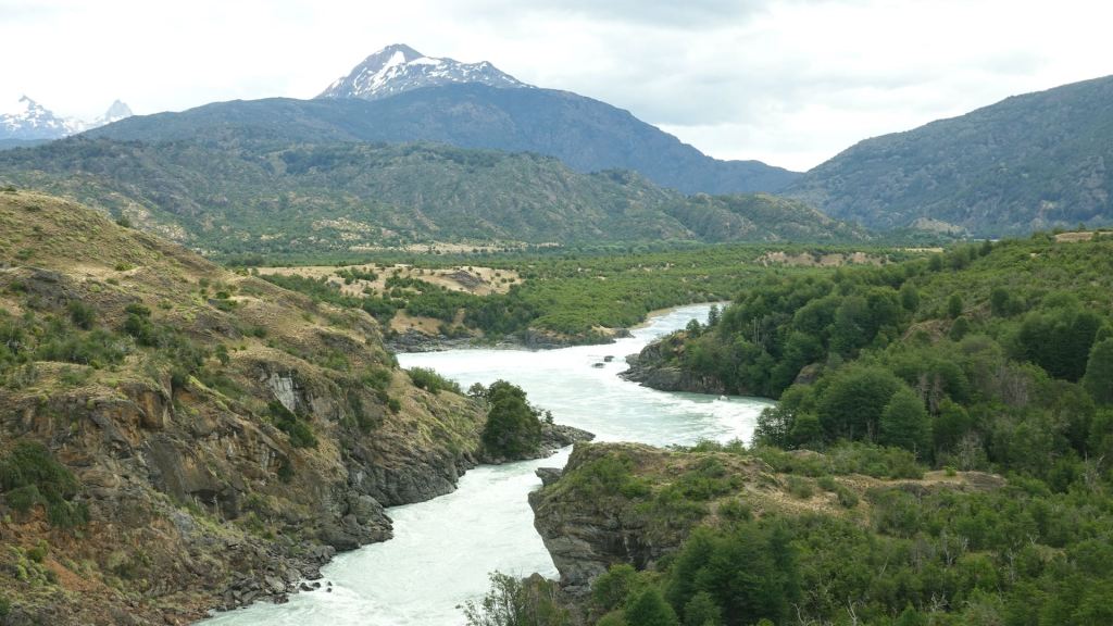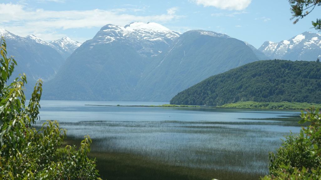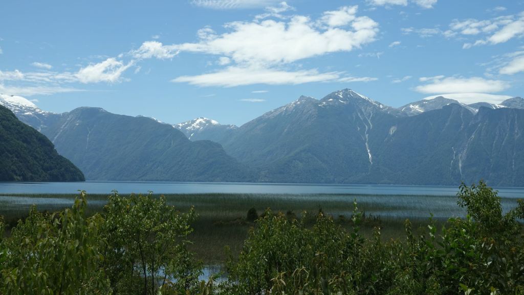 Von der Grenze fahre ich noch 70 Kilometer über eine ganz ordentliche, aber sehr staubige Piste, bis ich die Carretera Austral erreiche. Die Landschaft wird bis dahin zunehmend grüner und die Berge tragen zum Teil wieder weiße Kappen. Ich fühle mich sehr an die Schweiz erinnert!