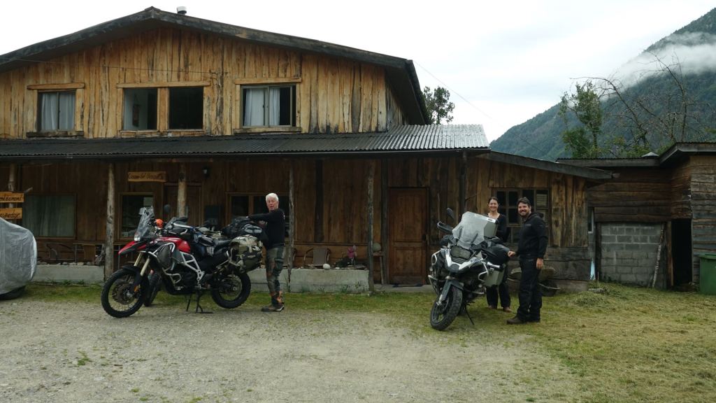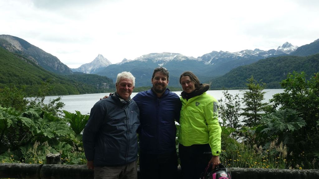 Ich bedanke mich und mache mich wieder auf den Weg, da sehe ich vor einem Restaurant zwei mir sehr vertraute Mopeds. Das eine eine rote F800GS und das andere eine weiße 1200GS Adventure. Drinnen im Restaurant treffe ich Ciro und Tiara, das Paar, mit dem ich vor einer Woche gemeinsam im Sturm von der argentinisch-chilenischen Grenze zur Fähre über die Magallanstraße gefahren bin! Und sie haben Steve im Schlepptau! Die Welt ist hier bei aller Großartigkeit doch sehr klein!