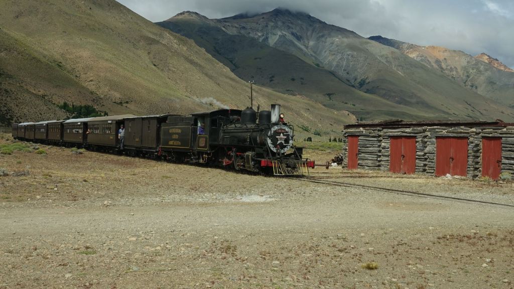 Nächstes Ziel ist Puerto Madryn, wo ich mit Miguel verabredet bin. Er ist ein guter Freund von Kalle aus Ollantaytambo, der mir diesen Kontakt vermittelt hat. Bei Verlassen von Esquel komme ich gerade zu spät an einen Bahnübergang, der kurz zuvor von einem Dampfzug überquert wurde. Ich treffe dort auf Jan und Hendrik aus dem Vogtland, die gerade ihre Drohne in den Koffern ihrer Yamaha Ténérés verpacken. Sie wissen, dass der Zug gleich nur 5 km entfernt im Zielbahnhof einfahren werde und nehmen mich mit dorthin, wo wir uns eine zeitlang nett unterhalten und wertvolle Tipps für die Weiterreise austauschen.