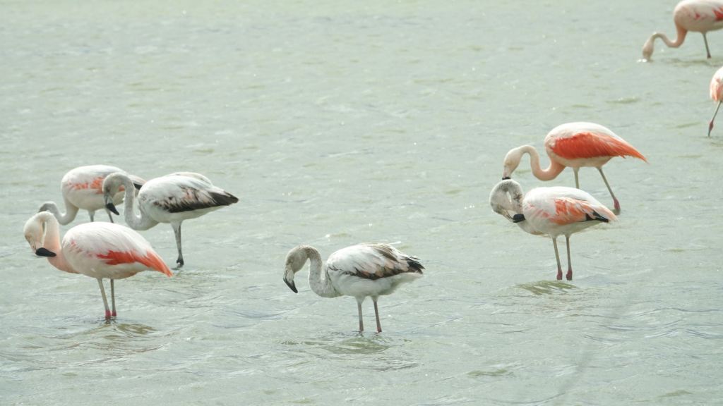 Miguel begleitet mich auf seiner Yamaha Fazer in die Stadt. Ich staune, wie er dieses reine Straßenmoped täglich über die 4 km lange grobe Schotterpiste zu seinem Haus bugsiert! Eine Enduro wäre hier bestimmt die bessere Wahl. Gleich bei der Einfahrt in die Stadt entdecken wir in einem Tümpel Gäste, die laut Miguel eher selten hier sind. Knallorangene Flamingos und ein paar graue Exemplare bevölkern den Tümpel trotz des dichten Autoverkehrs direkt nebenan.