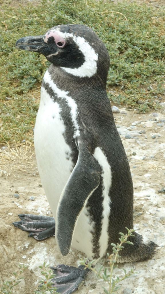 Nach einer guten halben Stunde auf der rutschigen Piste bekomme ich eine erste Bestätigung, als ich zur linken eine Kolonie von Magallan Pinguinen zu sehen bekomme. Pussierliche, kleine Viecher, die in Erdlöchern wohnen, sich aber gerne und oft draußen zeigen. Etwa zweihundert Exemplare tummeln sich im feuchten Wind, den sie bevorzugt von hinten über sich ergehen lassen.
