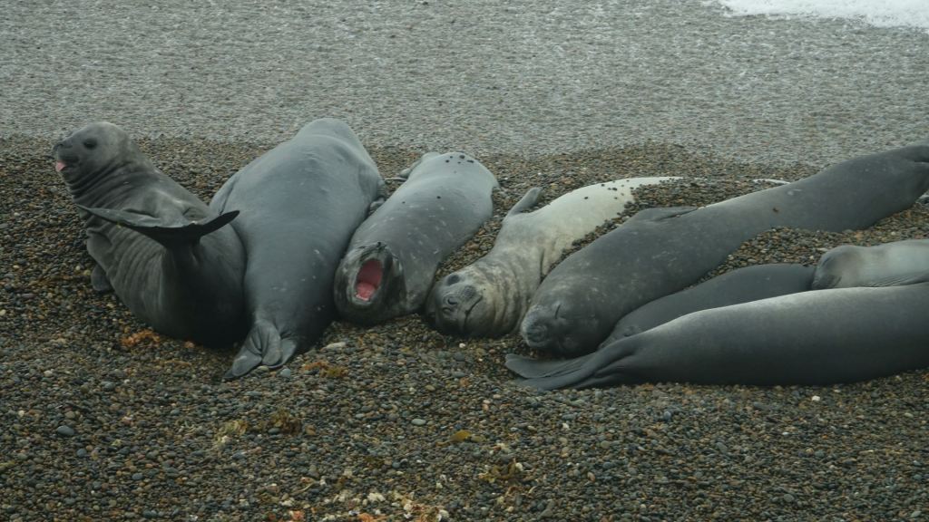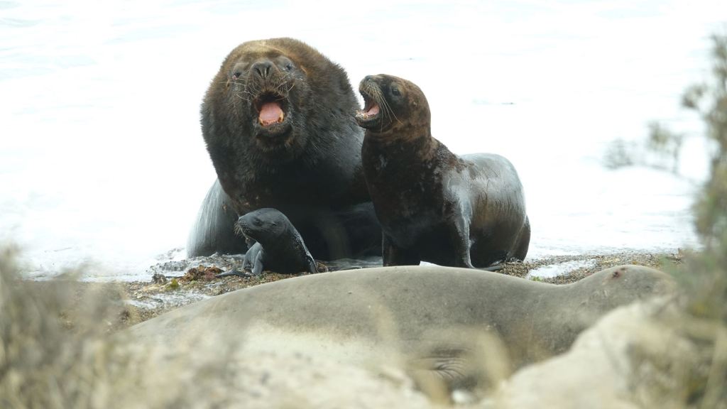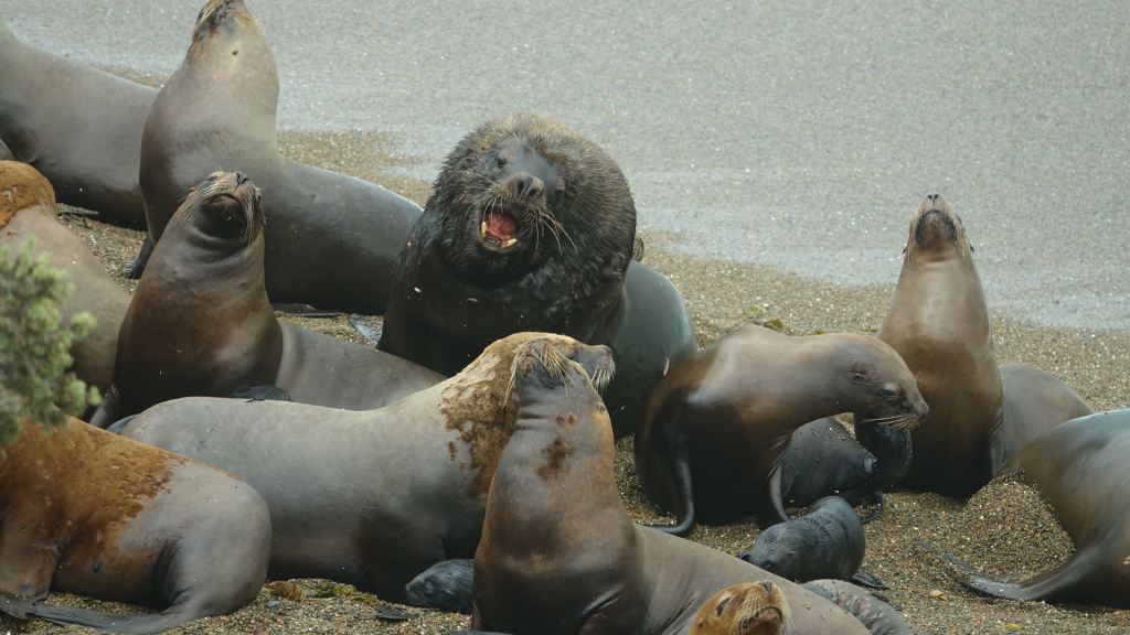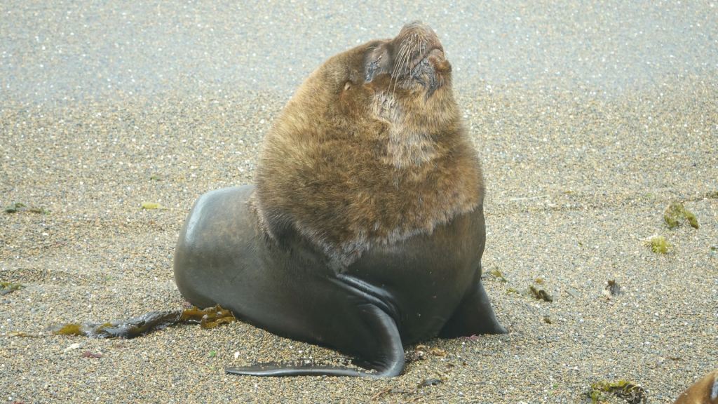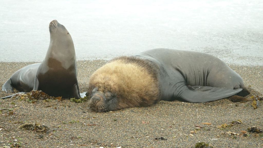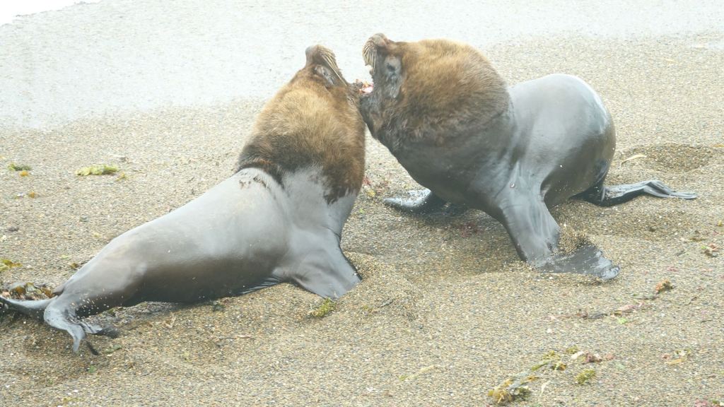 Noch ein paar Kilometer weiter wird’s dann wirklich interessant. Dass der Regen horizontal fällt ist gar nicht mehr relevant, als ich die Menge an Seeelefanten vor die Linse bekomme, die sich tief unter mir am Strand von der Brandung umspülen und dabei von den Kieselsteinen eingraben lassen. Es ist ein besonderes Spektakel, wenn sie sich gegenseitig immer wieder behaken und dabei ihre roten Mäuler weit aufreißen. Den Rest der Zeit scheinen sie lieber faul herumzuhängen und sich dabei gegenseitig zu wärmen.